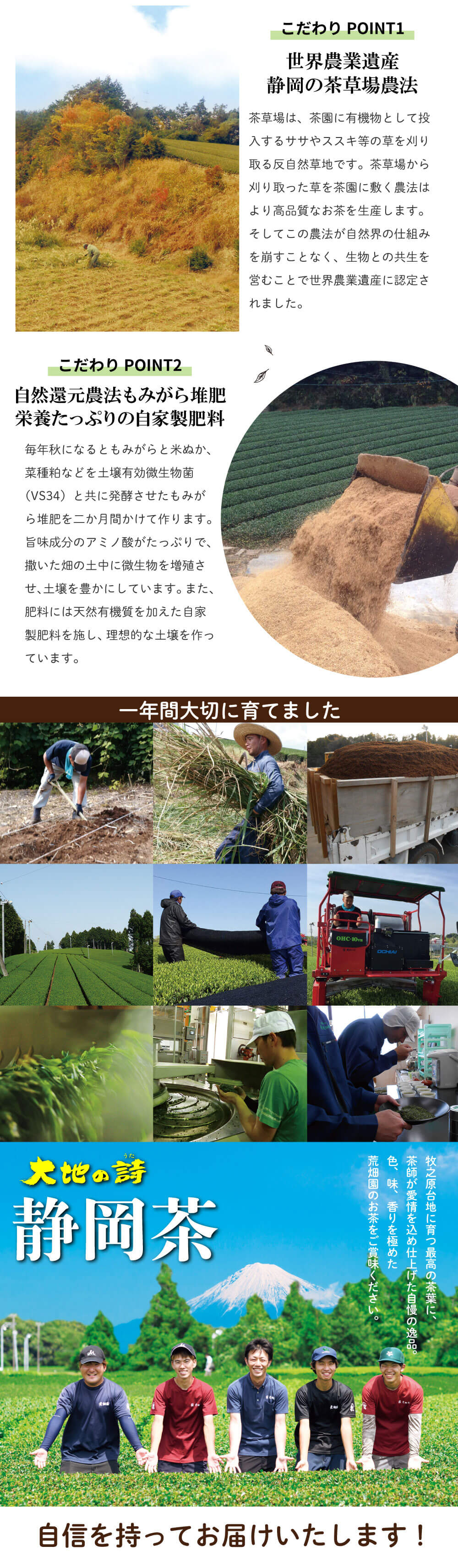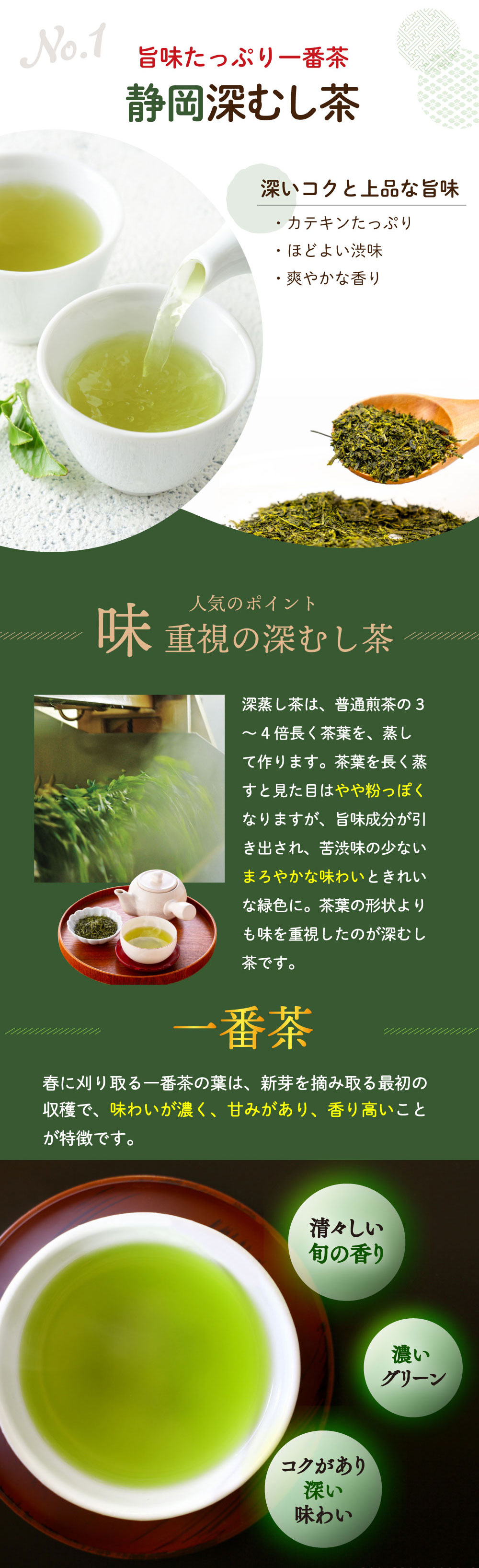 普通煎茶の3〜4倍長く蒸して作った深蒸し茶は見た目よりを味重視!深蒸し茶ならではの深いコクをお楽しみください。