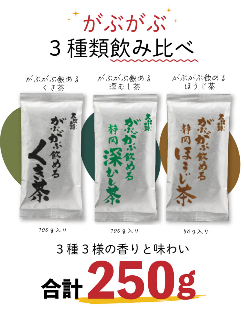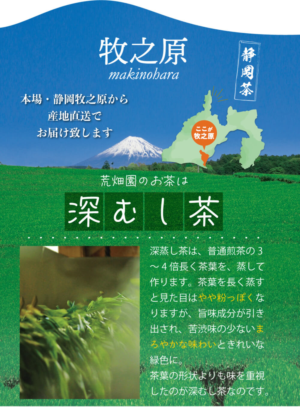深むし専門店こだわりの「がぶがぶ飲める静岡深むし茶」やリピーター続出の「がぶがぶ飲めるくき茶」、焙煎にこだわった「がぶがぶ飲める静岡ほうじ茶」荒畑園で大人気のお茶を福袋に詰めました♪