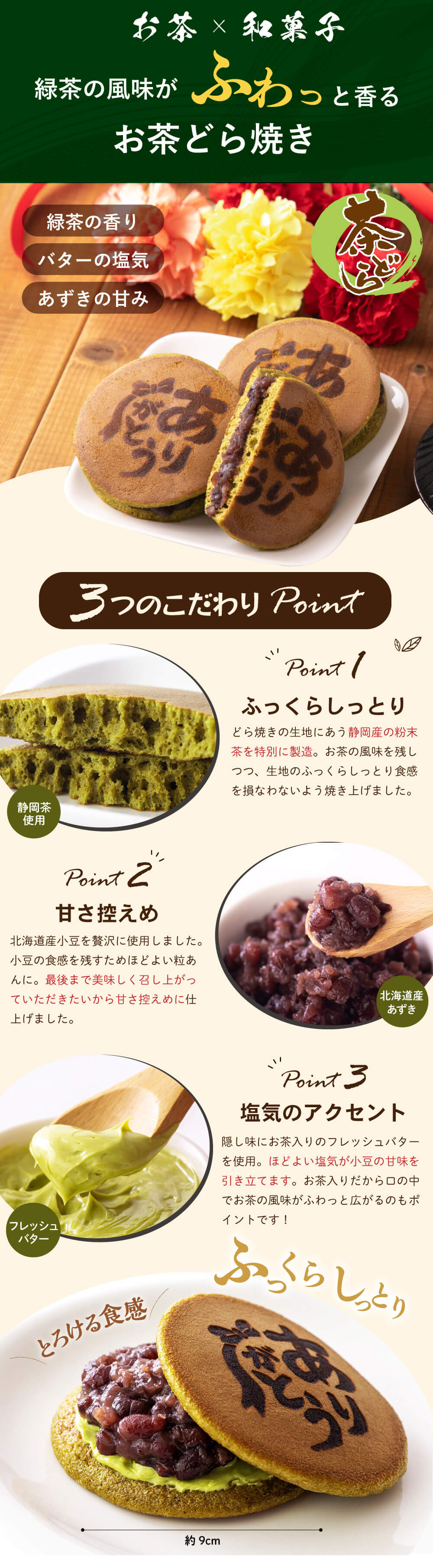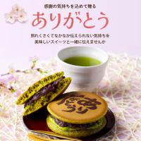 和菓子職人が丁寧に焼き上げました。生地は鮮やかな緑茶色、お茶入りフレッシュバターが甘さを引き立て、ふっくらしっとりとろける食感を味わえます。気持ちが伝えられるありがとう焼印が仕上げにジュワっと。