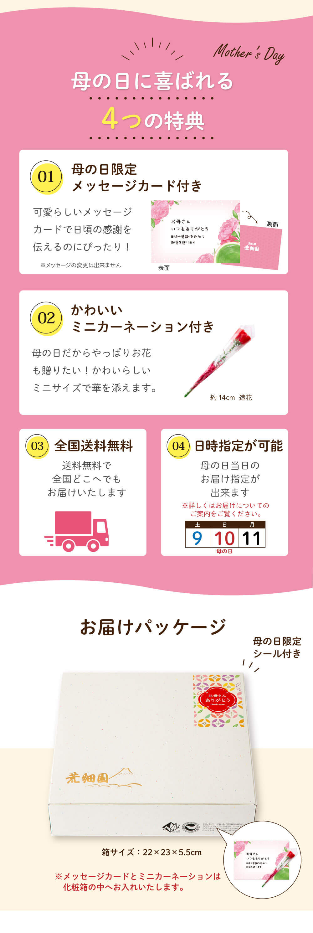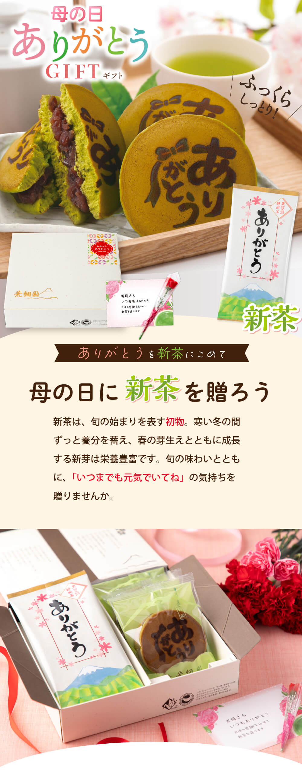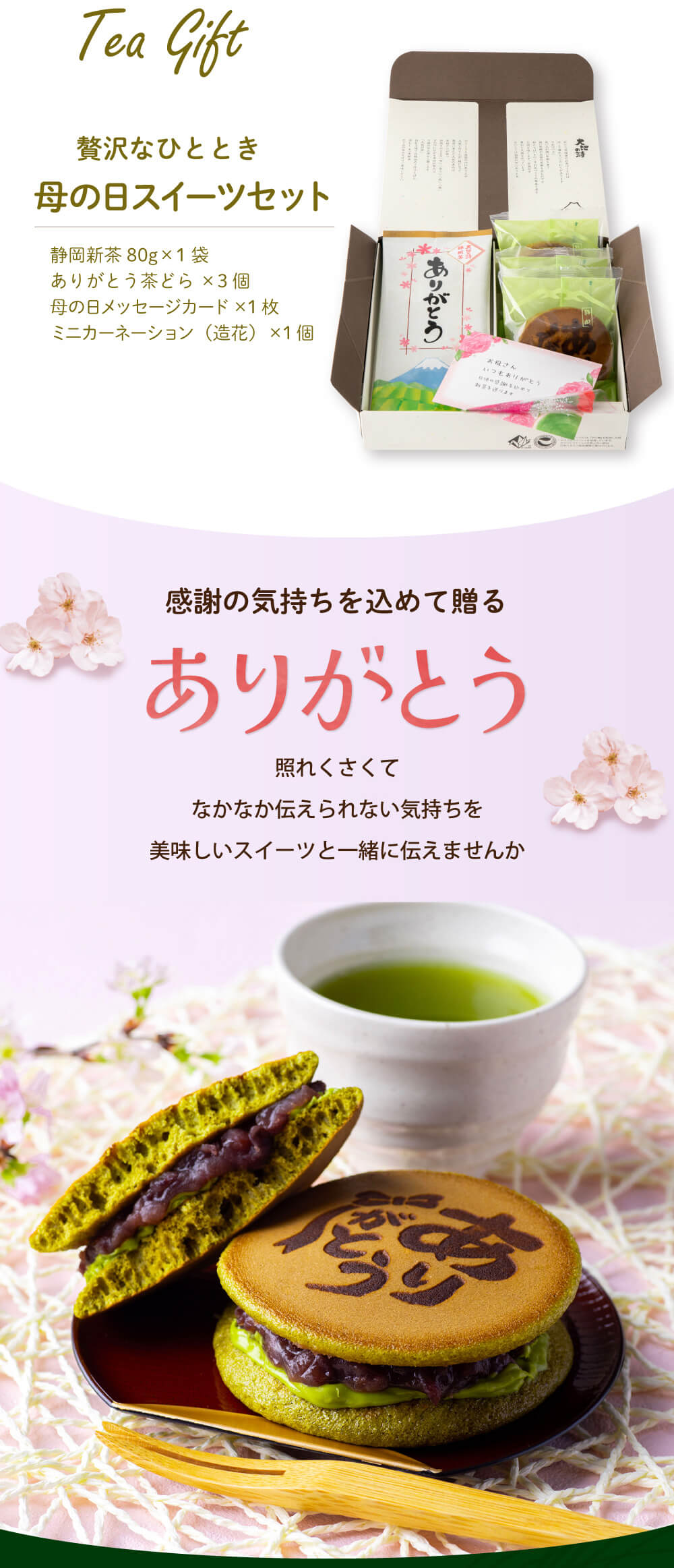 ありがとう茶どら×3個、静岡新茶80g×1袋、ミニカーネーション(造花)×1個、母の日メッセージカード×1枚