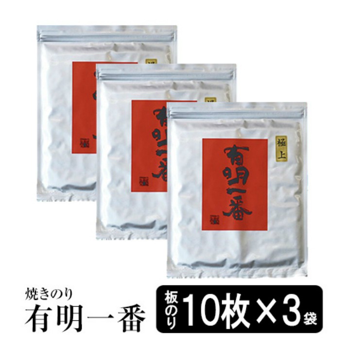 海苔 焼海苔 送料無料 高級焼きのり 【有明一番】 焼き海苔10枚入り×3袋セット 手巻き用 メール便送料無料 初摘みの焼きのり 一番のり おにぎり海苔 無添加