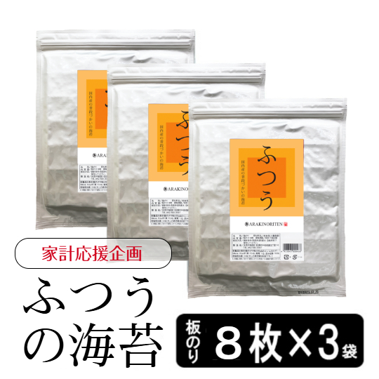 海苔 無添加 ふつうにおいしい焼きのり 8枚入3袋セット 焼き海苔 おにぎりのり 手巻き寿司 フードロス焼のり 無添加 送料無料 ポイント利用