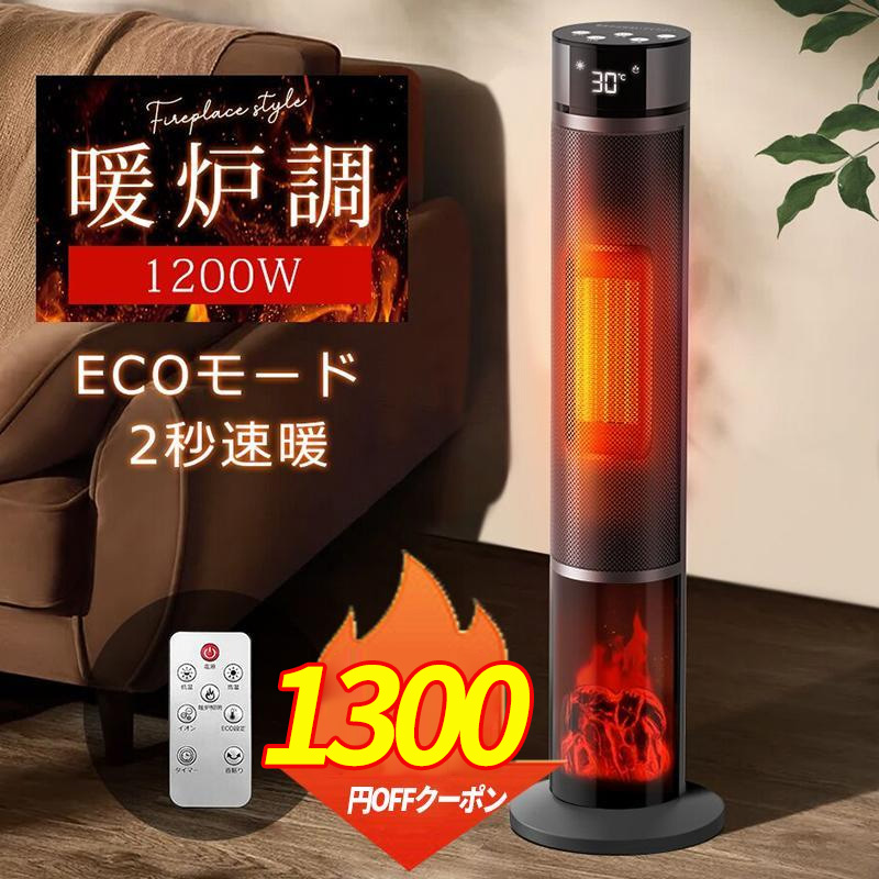 リモコン付き 2秒速暖 1200W タワー型 寒さ対策 温度調節 15畳部屋対応 3段階切替