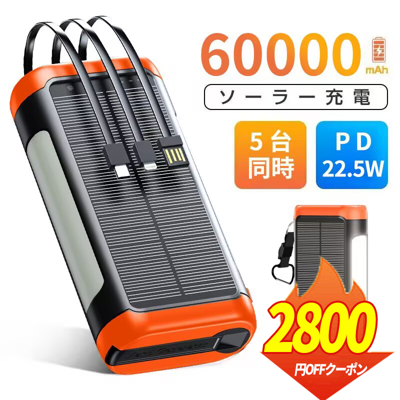 「クーポンで4,580円」ソーラーモバイルバッテリー モバイルバッテリー 60000mAh 大容量 急速充電22.5W ケーブル内蔵+USBポート ソーラー充電器