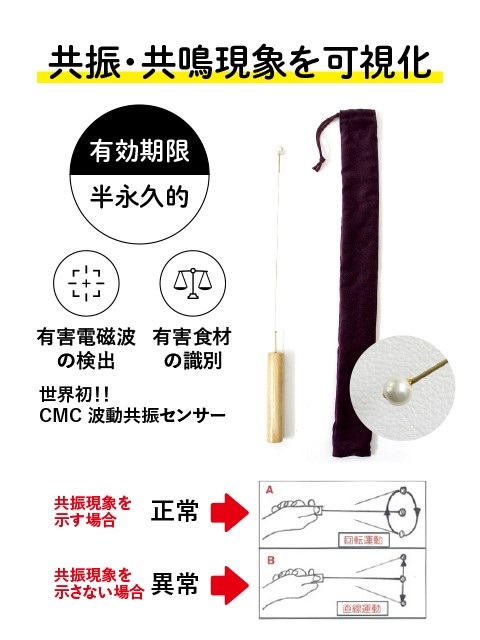 CMC波動共振センサーは、この固有振動の共振・共鳴現象を、きわめて簡単に、誰にでも、いつでも、短時間に、しかも遠隔でも、見える化(可視化)できます。●CMC波動共振センサーロッド先端の動きのパターンによる波動共振現象の見える化法A)共振現象を示す場合(1)身体に異常がない場合 ロッドが回転運動(2)その物質が身体に良い場合(3)両者の成分・構造等が同じ物質の場合B)共振現象を示さない場合(1)身体に異常がある場合 ロッドが直線運動(2)その物質が身体に悪い場合(3)両者の成分・構造等が異なる物質の場合CMC総合研究所の商品です商品とこちらの資料を PDFでみれるように送ります。
