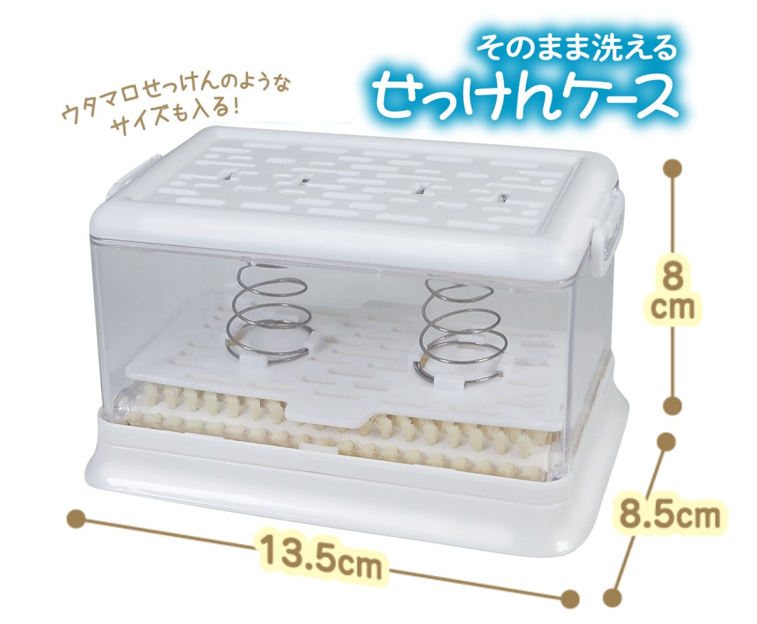 そのまま洗えるせっけんケース人気のウタマロせっけん対応!固形せっけんを入れて動かすだけの簡単仕様。使用後はサッと水切りして付属トレーに置くだけ。濡れたままでもおけるので手間がかかりません。