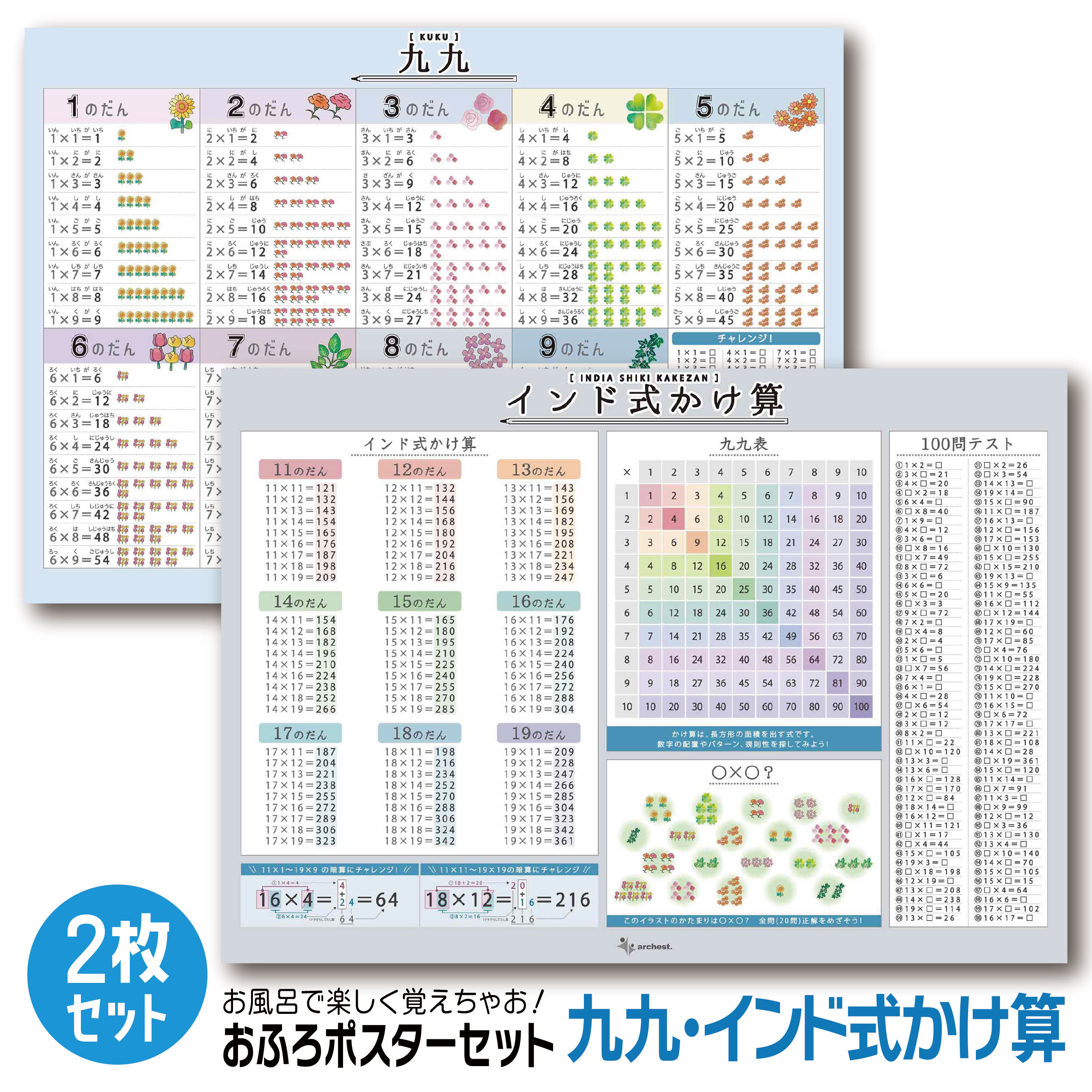 ふりがな付きで暗唱しやすい「九九表」と、計算力の向上に役立つ「インド式かけ算」の2枚セットです。 イラスト付きで情報が記憶しやすくなります。