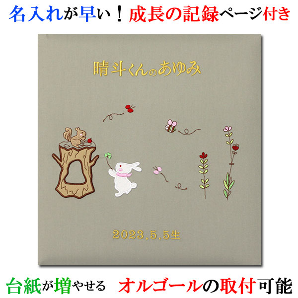 アルバム 名入れ ベビー 名入れアルバム 名前入りアルバム フォトアルバム 出産祝い 刺繍で赤ちゃんの名前入り 台紙が増やせる オルゴール付きも可 【167-065】森の動物たち