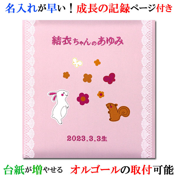 アルバム 名入れ ベビー 名入れアルバム 名前入りアルバム フォトアルバム 出産祝い 刺繍で赤ちゃんの名前入り 台紙が増やせる オルゴール付きも可 【176-045】ウサギとリスピンク