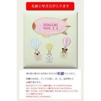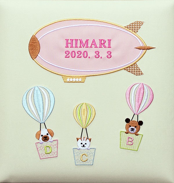飛行船と気球に乗った動物たちの刺繍が入った刺繍名入れベビーフォトアルバム。