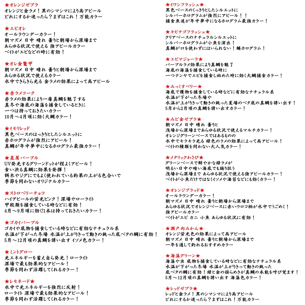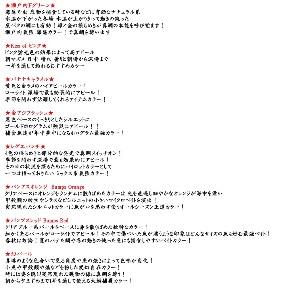 | 【爆釣 鯛ラバ】シリコン ラバーシート 14.5cm×30.5cm シリコンネクタイ BLUE ABYSS 船釣り オフショア 波動 海釣り 仕掛け タイラバ 釣り アウトドア ブルーアビス フィッシング シリコン ラバー 人気 爆釣 真鯛 ルアー 交換用 パーツ 釣れ過ぎ スカート カスタム パーツ BLUE ABYSS が生み出す 自作の鯛ラバ ネクタイが作れる大サイズのシリコンラバー BLUE ABYSS と YouTube はに丸 船長がセレクトした独自カラーのシリコンラバーで 鯛ラバをカスタム・製作が可能 他にはない自分だけの鯛ラバ仕掛けを作って差をつけよう! ベイトの種類によって 真鯛の「当たりカラー」は刻一刻と変化する! 定番のレッド・オレンジ系から アピール力の強いチャート系・ナチュラルな海老・小魚カラーまで 全30色 をラインナップ!「今の海」にマッチする色が必ず見つかる! ・オレンジゼブラ ・エビオレ ・オレ金鼈甲 ・赤ラメコーク ・イモリレッド ・星屑パープル ・ストロベリーチョコ ・ゴカイパープル ・ミントグロー ・レモネード ・イワシフラッシュ ・キビナゴフラッシュ ・エビマジョーラ ・みっくすベリー ・みど金ゼブラ ・メタリックわさび ・オレンジブラッド ・瀬戸内みかん ・海藻グリーン ・レッドゼブラ ・瀬戸内Fグリーン ・kissオブピンク ・バナナキャラメル ・金アジフラッシュ ・レゲエパンチ ・バンプスオレンジ ・バンプスレッド ・幻パール ・オールクリア ・ブルーライフ 【注意事項】 取扱説明書マニュアルは付属しません 過度な負荷をかけると破損や破れの恐れがあります 直射日光の当たる場所での保管は避けて下さい モニターの環境により実際の商品と色の見え方 素材感が変わる場合があります 製造時期により外観デザイン及び仕様・サイズは予告なく変更することがあります 簡易包装での送付となり包装に折れやシワが入っている場合がございますご理解お願いいたします 内容: ラバー1枚 カラー:全30色 サイズ: 縦約14.5cm、横約30.5cm (多少の誤差が生じる場合があります) 素材:シリコン製品 生産国: CN 検索ワード タイラバ 鯛ラバ たいらば BLUE ABYSS ブルーアビス 釣り 釣具 ルアー マダイ 真鯛 海釣り 船釣り オフショア フィッシング 遊動式 誘導式 ヘッド スカート ネクタイ セット 仕掛け 疑似餌 根魚 ロックフィッシュ アマダイ 甘鯛 青物 底物 大物 釣り用品 釣り道具 ソルト アウトドア レジャー 趣味 プレゼント ギフト 人気 おすすめ |