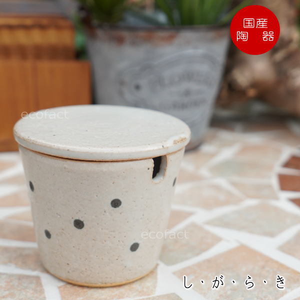信楽焼のシュガーポットです。かわいい柄で普段使いのできる手ごろなお値段の丸十製陶の陶器です。 特徴として 球模様、線は窯の場所にもよりけりで薄くでたり濃くでたりします。また釉薬を塗り落ち着かせる際にできる釉薬だまり 垂れが蓋に見られます。内側に釉薬を塗る際の素地が見える箇所ができる場合がございます。これらは手作業で避けされない部分でもあるのでどうぞご理解ください。