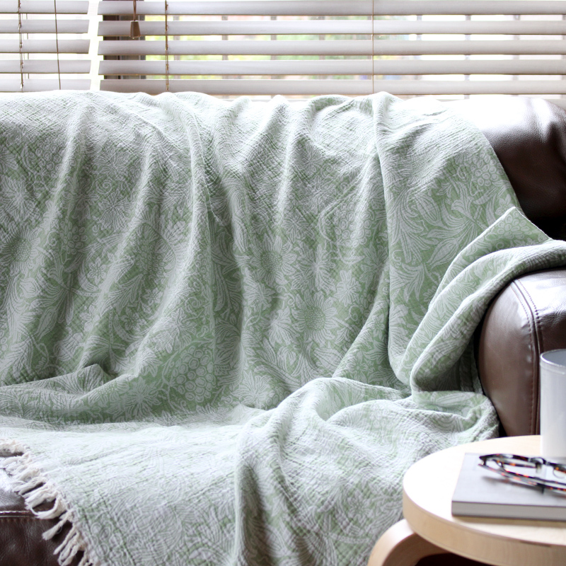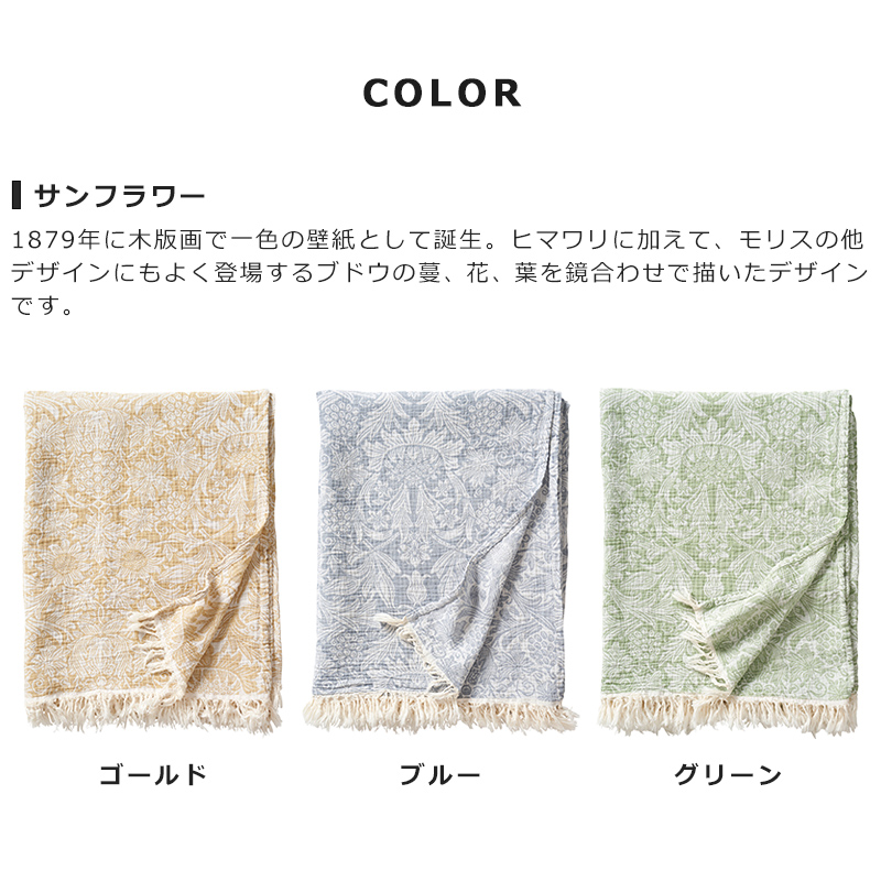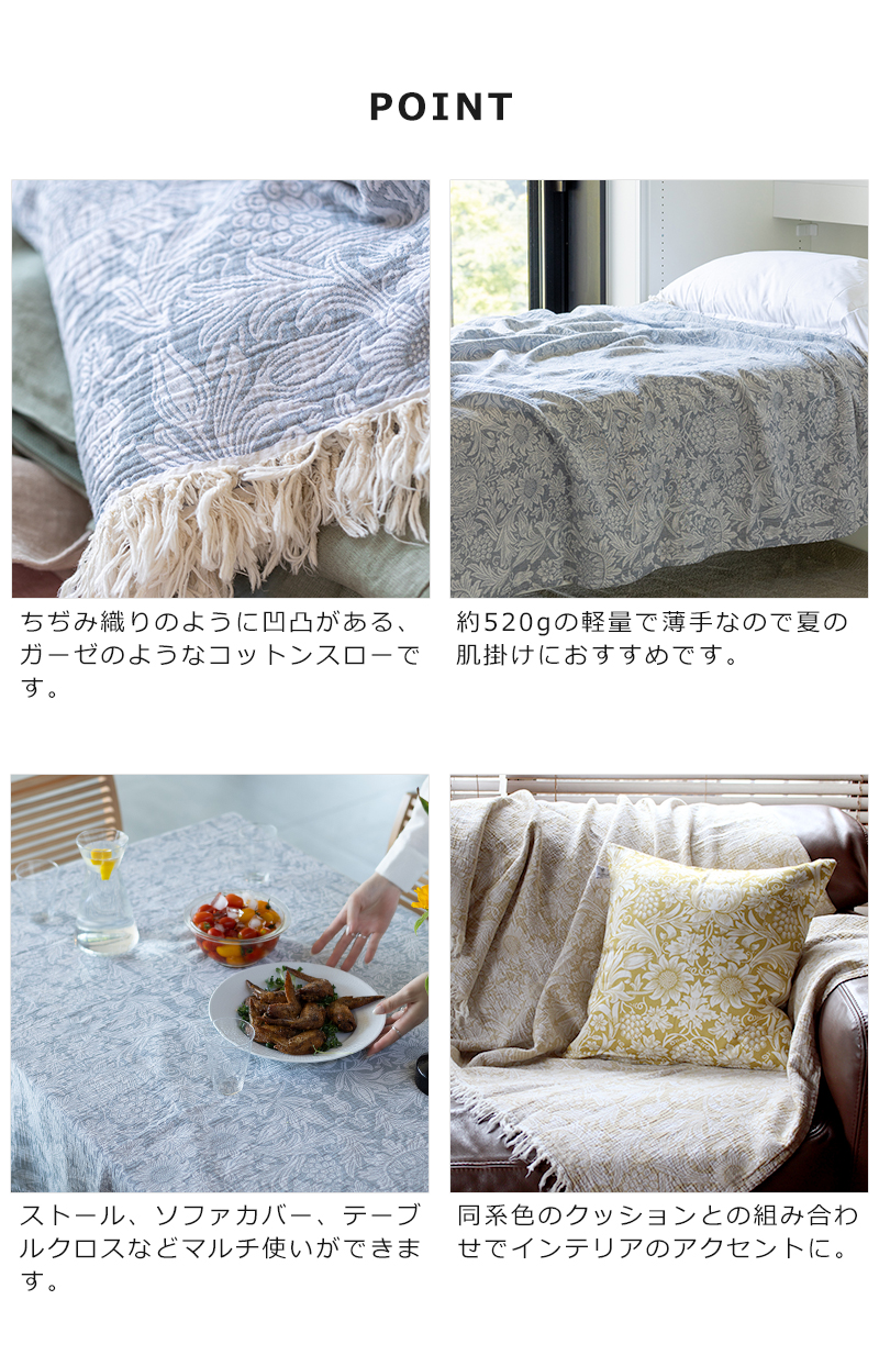 | 「優しいカラーの、ガーゼのように薄くて軽いコットンスローです。」 スウェーデン南西部の村で誕生したテキスタイルメーカーKLIPPAN。140年を超えるときを経て、世界中で愛されるブランドとなっています。創業以来、一貫して天然繊維と高い品質にこだわり、丁寧に製品を作り続けています。 英国デザイナーのウィリアム・モリスによる「サンフラワー」はヒマワリ、ブドウの蔓、花、葉を鏡合わせで描いた単色使いのデザイン。繊細な曲線の植物柄と優しいカラーは和室、洋室問わずインテリアに調和します。 サステナブルなBCI認証を受けたコットンは、インド企業の糸を使用し、スローは薄手のコットンの織りを得意とするポルトガルのテキスタイルカンパニーにて生産しました。コットン100%なので洗濯ネットに入れて、洗濯機で丸洗いが可能です。 ちぢみ織りのように凹凸があるガーゼのようなコットンスローは、軽量で肌に密着しないので、夏の肌掛けやストールに最適です。アウトドアや海辺で水着の上に羽織ったり、ソファカバー、テーブルクロスにも使うことができるマルチなコットンスローです。 |