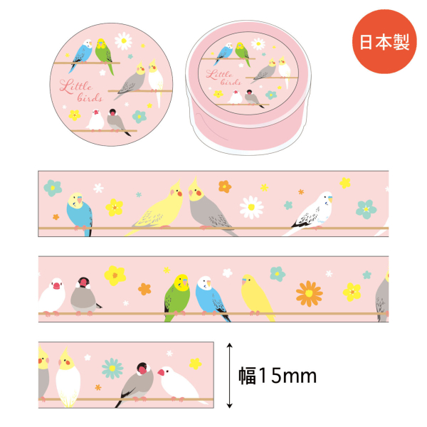 (廃番/在庫限り) 鳥シリーズ pi: リトルバード 15mm マスキングテープ / 可愛い マステ セキセイインコ 文鳥