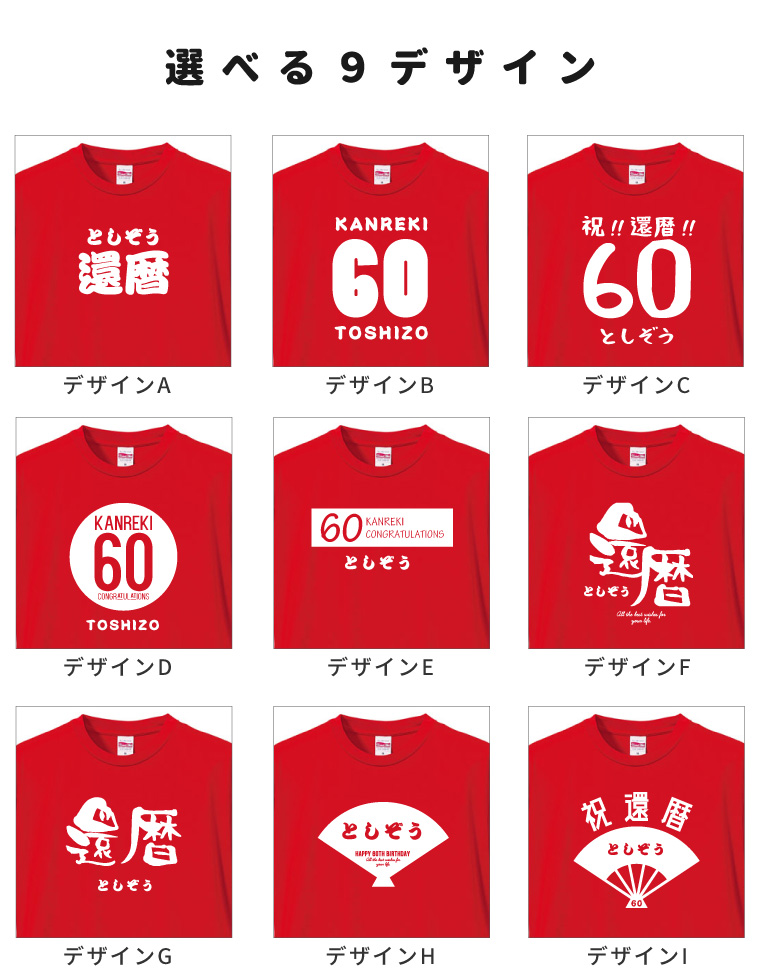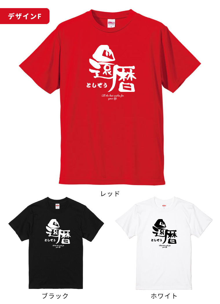 還暦の定番 "赤色"はもちろん、黒色や白色のTシャツもご用意。ボディーカラー3色、デザイン9種類からお好きな組み合わせをお選びください。