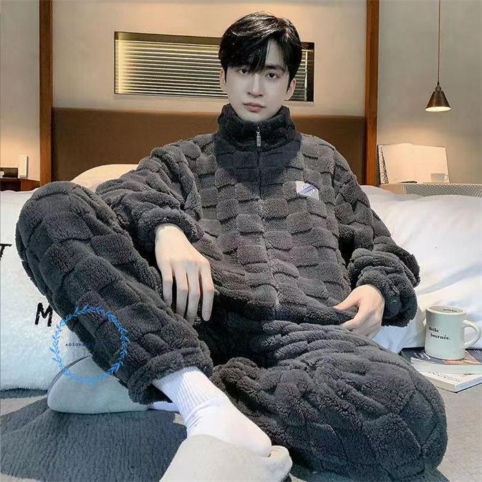 パジャマ メンズ 秋冬用 ルームウェア セットアップ 部屋着 2点セット 上下セット コーラルフリース 長袖 長パンツ チェック柄 単色 立ち襟 ジップアップ ゴムひも 無地 暖かい 前開き もこもこ ふわふわ 上下 セット 厚手 裏起毛 裏ボア 防寒 長パンツ トップス