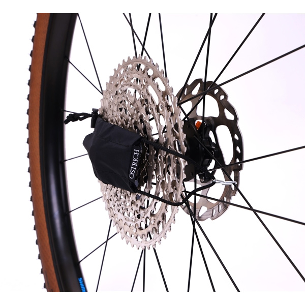 装着はローター側のスポークにSカンを引っかけ、ドローコードで絞るだけ。 (Sカンは金物でなので、カーボンスポークなど気を使われている方はご遠慮ください。)