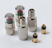 機能としては、空気圧が300kPa以上の時は、緑色の外筒が内圧で押し上げられ、表示部がすべて緑色となります。 内圧の減少とともにこの緑色の外筒が降下してゆき、まず黄色部分が露出してきます。 (黄色部分、赤色部分は固定で動きません)