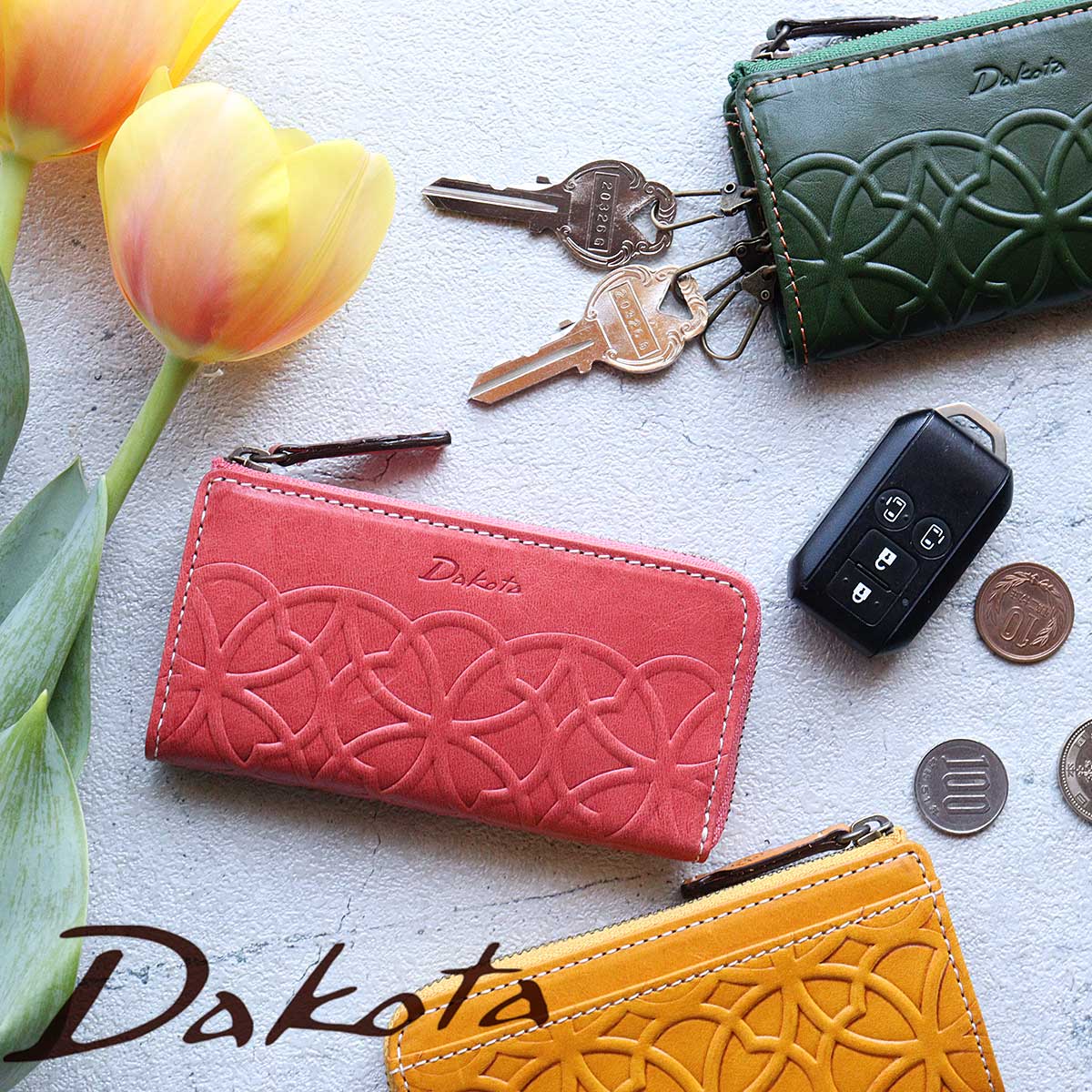 キャッシュレス対応のキーケース付きのミニ財布。キーケースとミニ財布が一緒になった便利なデザインです。全体に施された型押し模様が美しく、Dakotaのロゴの刻印がさりげなくワンポイントになっています。外側背面にポケット付き。