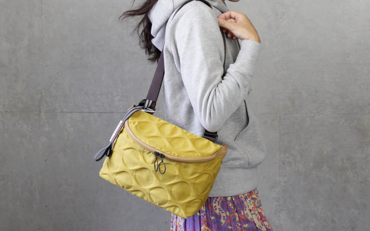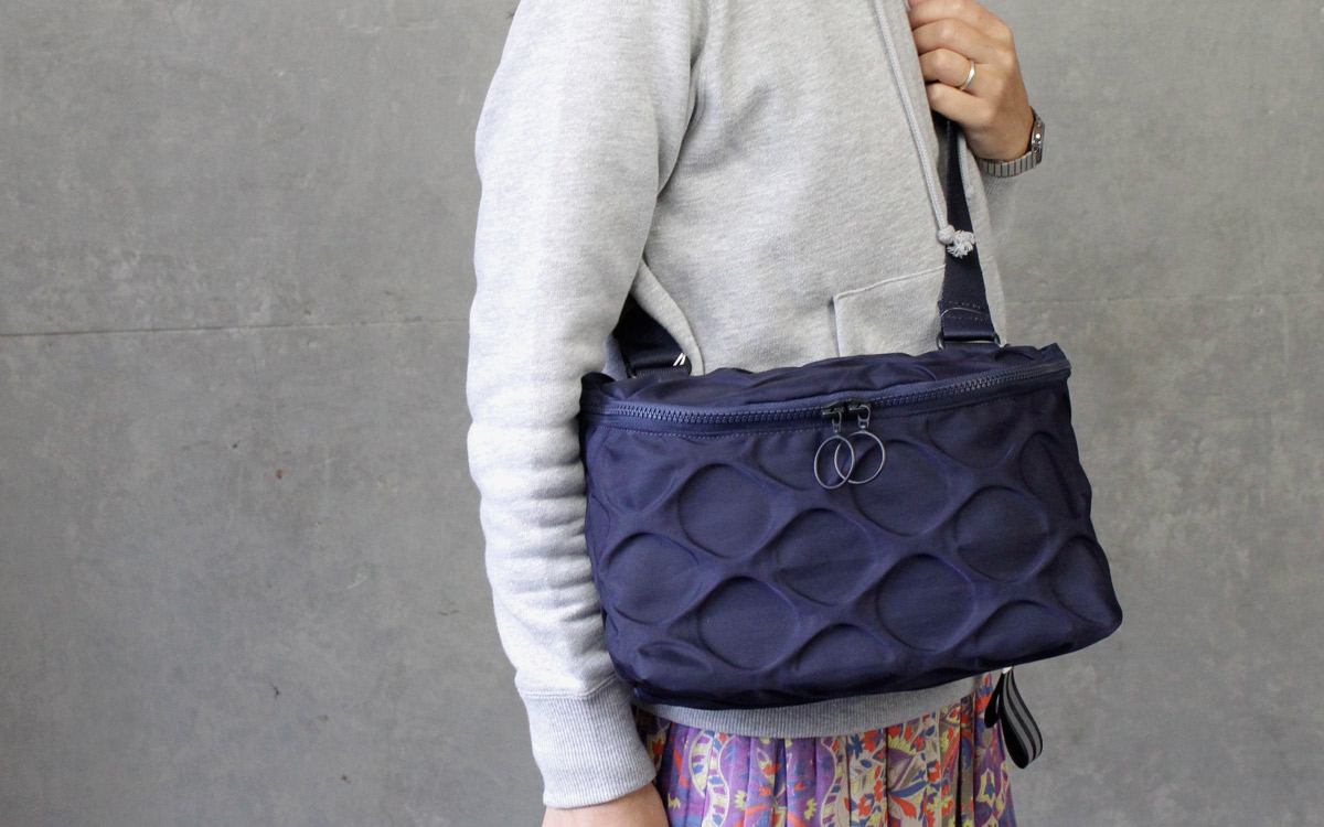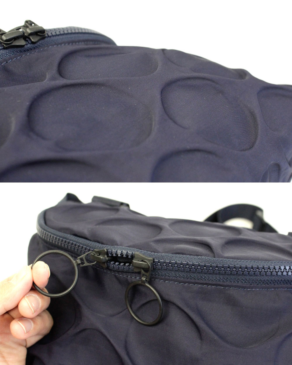 そのナイロンにディボック加工という凸凹のドットの型押しを施し、スポーティーでありながら優しいフォルムに仕上げました。サラッとした柔らかな素材なので着用した際も身体に寄り添うようになじみストレスがありません。ジッパーは便利なWジップ。開け閉めがしやすいビスロンファスナーを採用。ファスナーパーツは大きなリングになっているので指をひっかけての開閉がしやすくなっています。