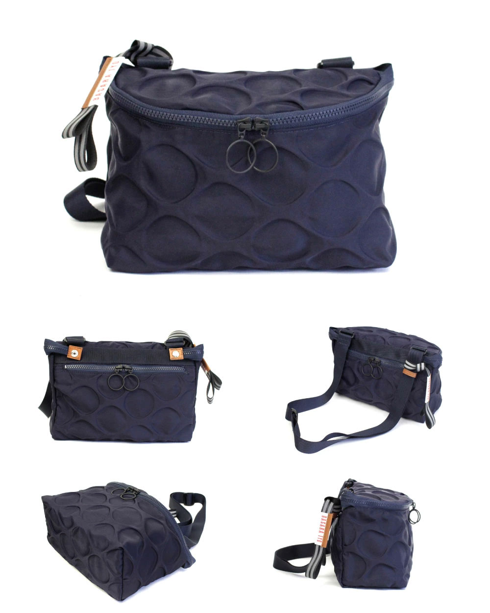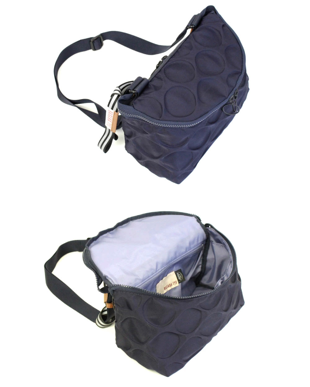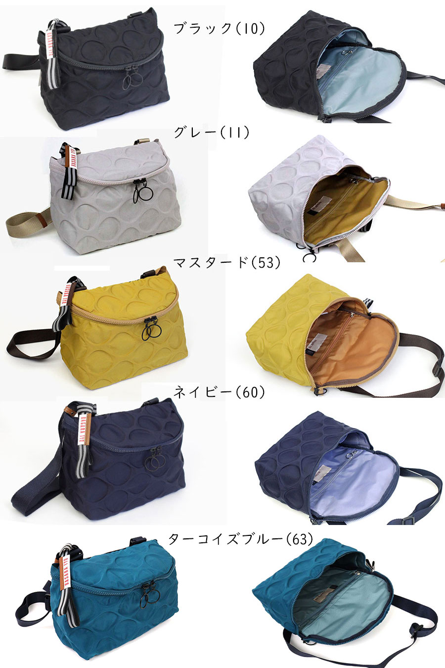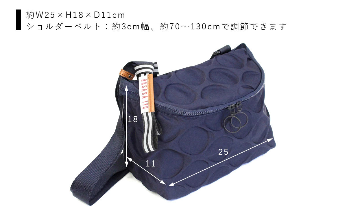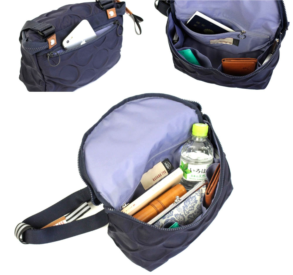 半円状に大きくがばっと開くので出し入れがとってもしやすいです。内側には鍵や細かな物を入れられるオープンポケットが4つとファスナー付きの小物入れが1つ付いています。整理がしやすく機能的です。ショルダーベルトは約70〜130cmで調節可能。肩掛け、斜め掛けが可能です。底面はクッション材入りなので型崩れがしにくいです。毎日気軽に使えるポーチでありながら、小さくたためて軽いので、旅行のサブバッグとしても幅広くお使いいただけます。リフレクターチャーム付き。
