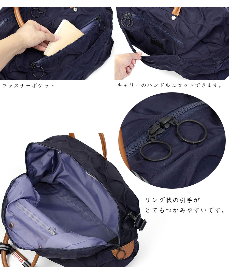 取り外し可能なショルダーベルトは約65〜130cmで調節可能。内側には大きなオープンポケットが2つと大小のファスナー付きポケットが付いています。細かな物も整頓して収納可能。1.2泊程度の旅行だけでなくオフィス帰りのジム通いにもOK。スポーティーでありながらおしゃれで使い勝手の良いトラベルシリーズです。