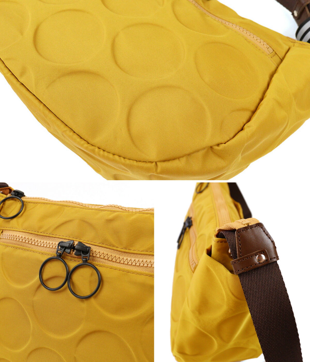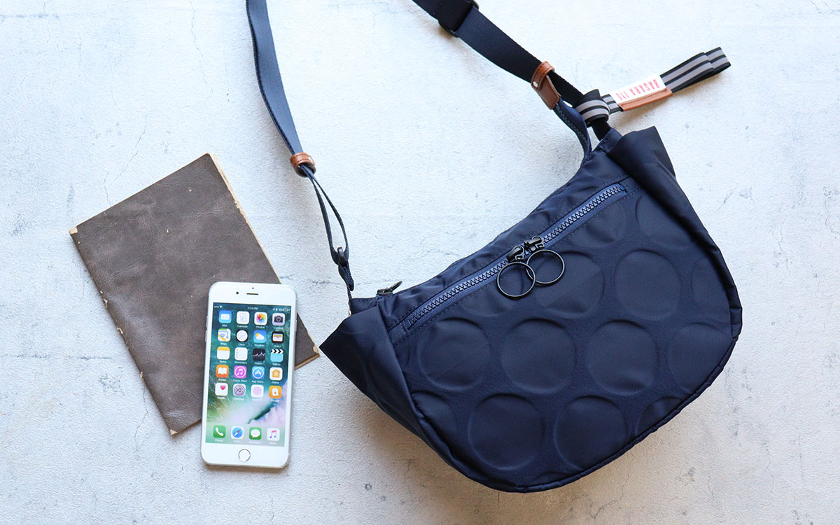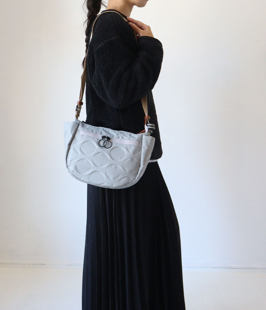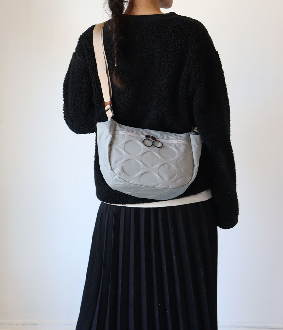 体にフィットするデザインの半円形のミニショルダーバッグ。