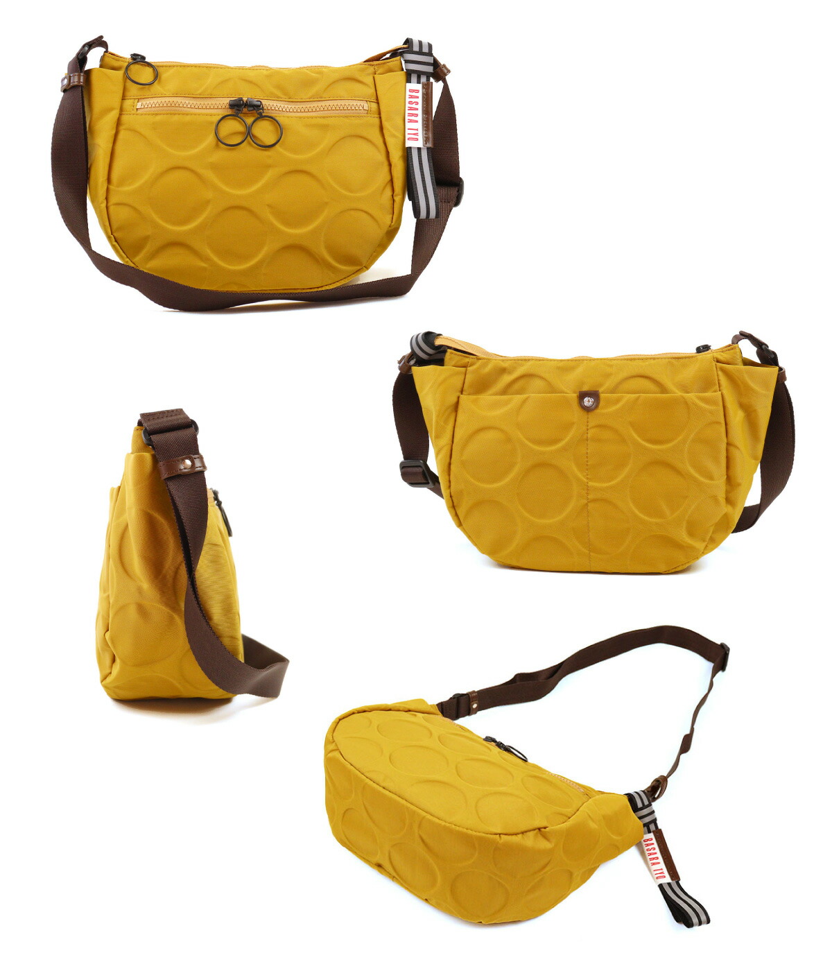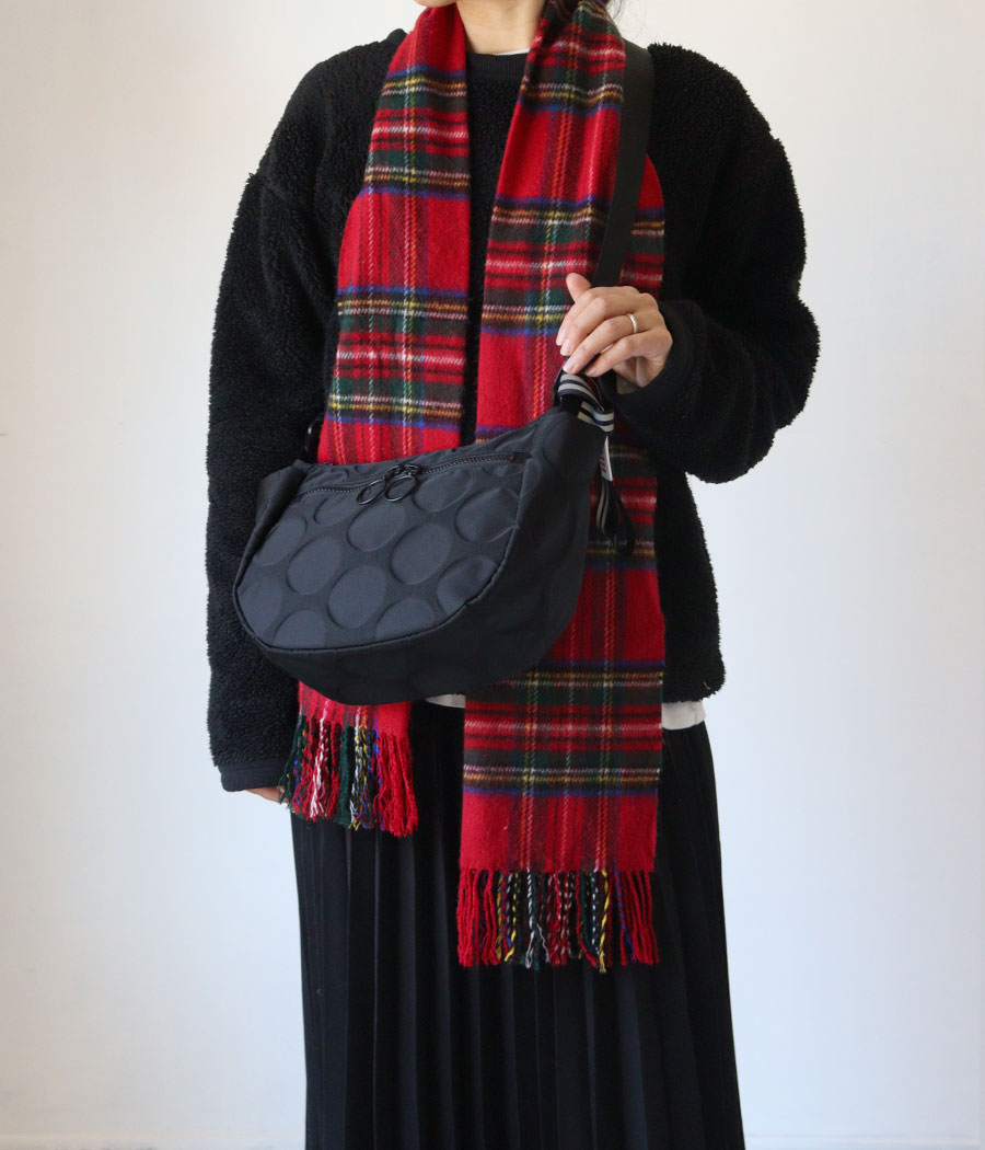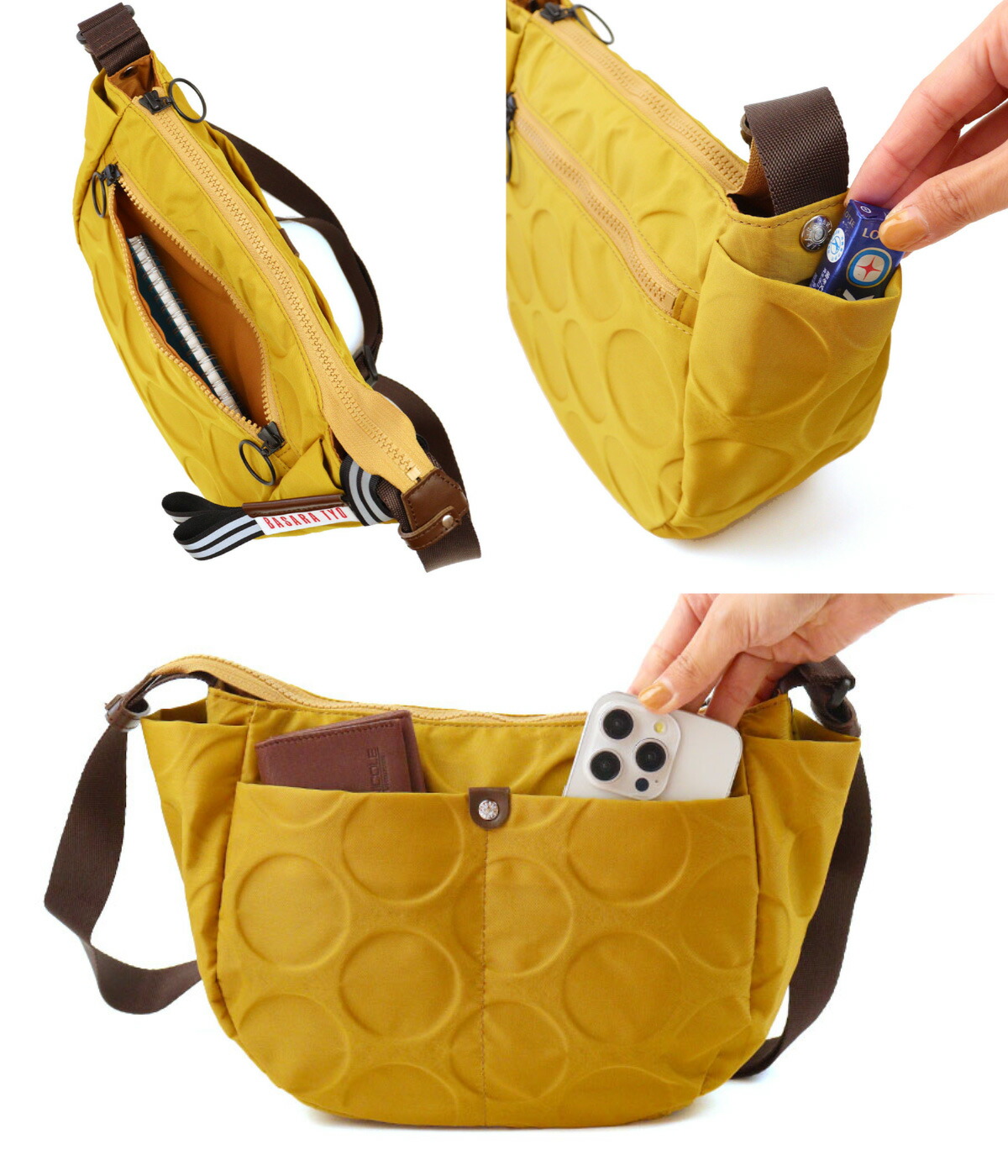 体にフィットするデザインの半円形のミニショルダーバッグ。