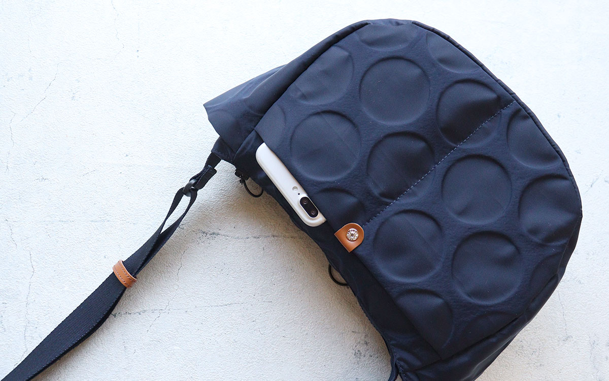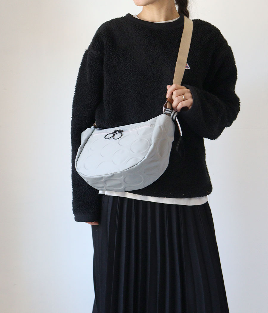そのナイロンにディボック加工という凸凹のドットの型押しを施し、スポーティーでありながら優しいフォルムに仕上げました。サラッとした柔らかな素材なので着用した際も身体に寄り添うようになじみストレスがありません。