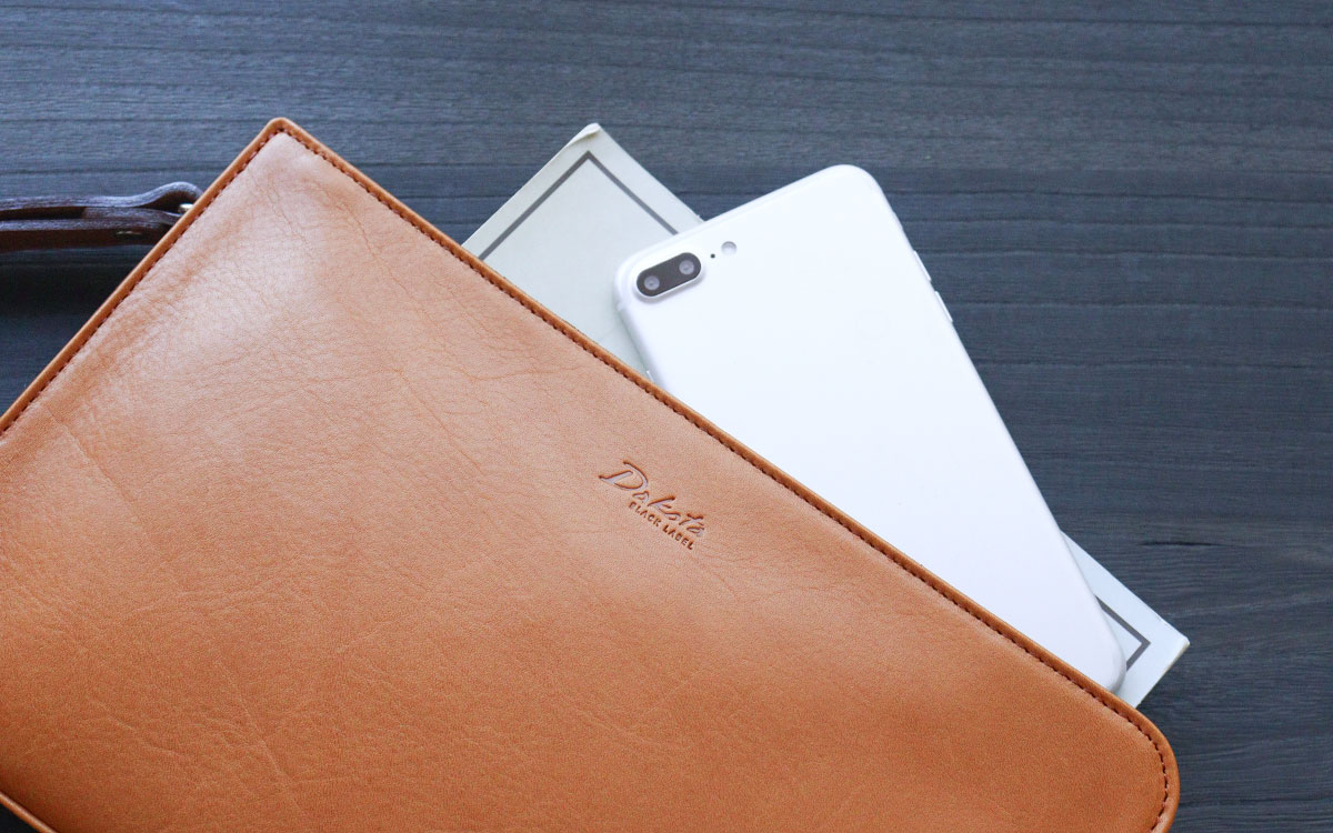 日本の職人が丁寧に縫製した上質な作り。フロントにはDakotaのロゴが刻印されています。ファスナーの端は、ホックで留めている形になっています。