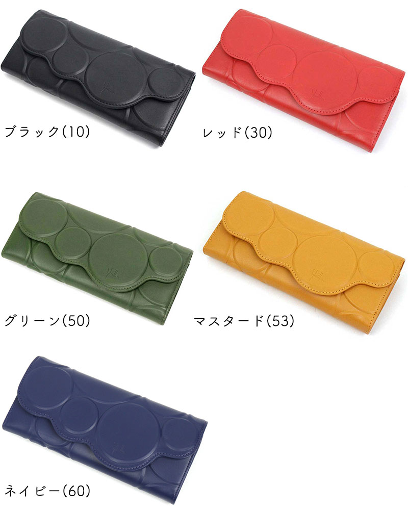 牛革に大小様々なサイズの円を大胆に型押しし、ぷっくりとした凹凸が楽しめるシリーズです。型押しに合わせたスカラップ風のデザインカットは個性的で目を引くこと間違いなしです。新たにデザインしたロゴ入りのオリジナル引き手もお財布の特別感をより一層引き立てます。