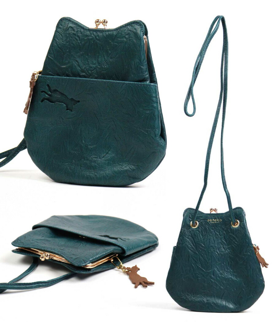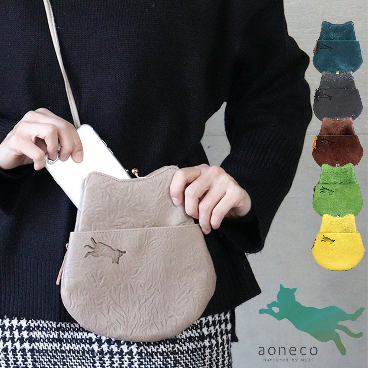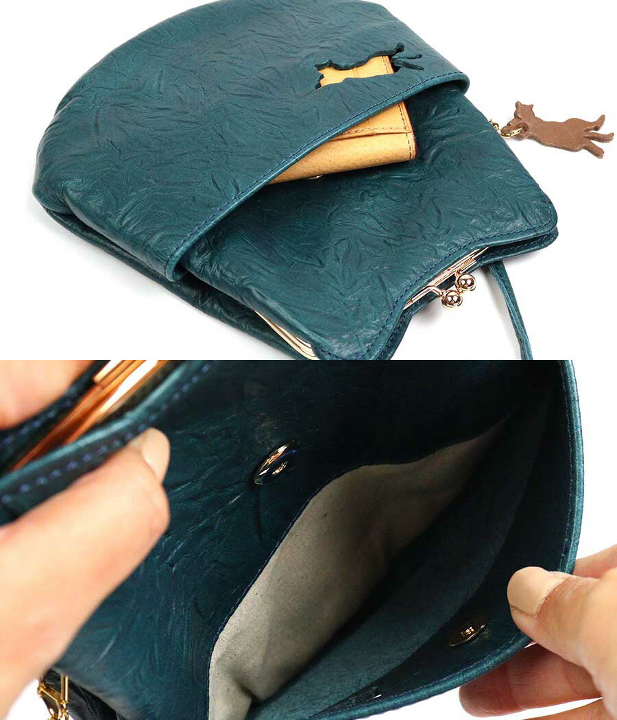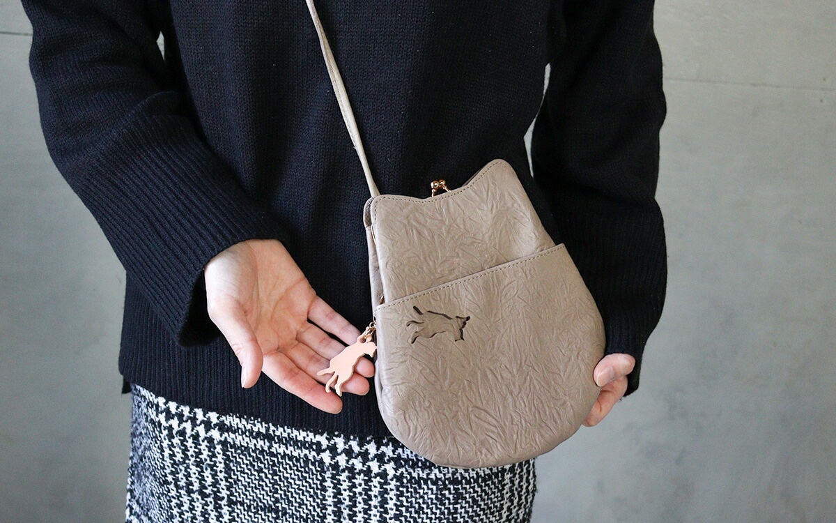 やわらかく手になじむ革を使用し、1つ1つ職人が丁寧に仕立てています。がま口特有の丸いフォルムも大事にしながら、さりげなくネコ要素をプラスしました。収納力抜群のすっきりとしたシルエットのスマホポシェットです。