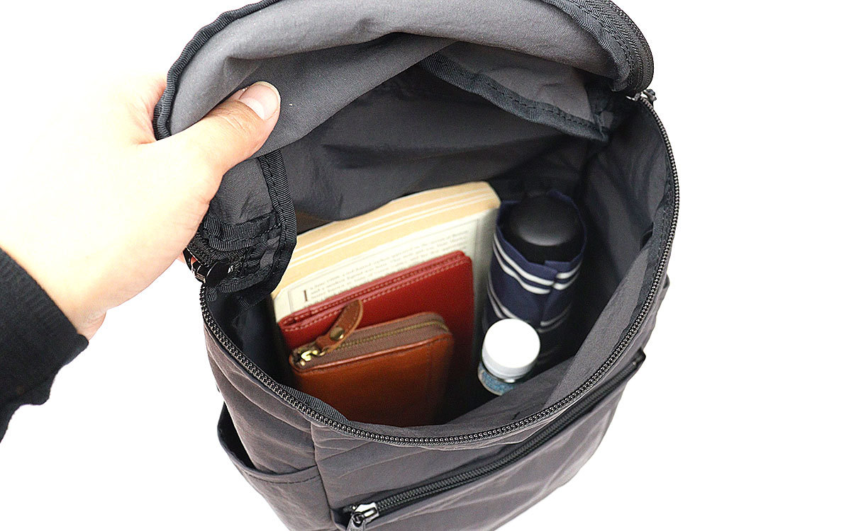 長財布、500mlペットボトル、折りたたみ傘、厚みのある本がすっぽり入りました。さらにオープンタイプのポケットにA4ファイルやB5雑誌も収納できます。スリム幅でスタイリッシュなルックスですが、マチが広く収納力も兼ね備えています。