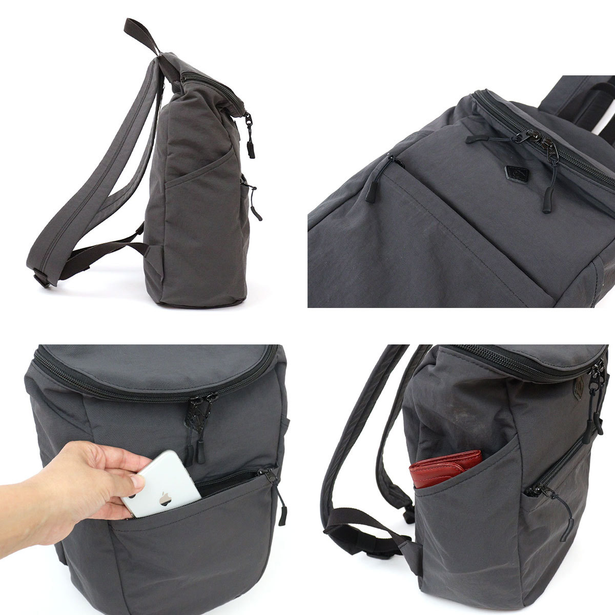 ナイロンはタフで比較的メンテナンスがしやすい特徴を持った素材。多少の雨や汚れを気にすることなく使えます。正面にはジッパーポケットがあり、両サイドにはオープンポケットがあります。