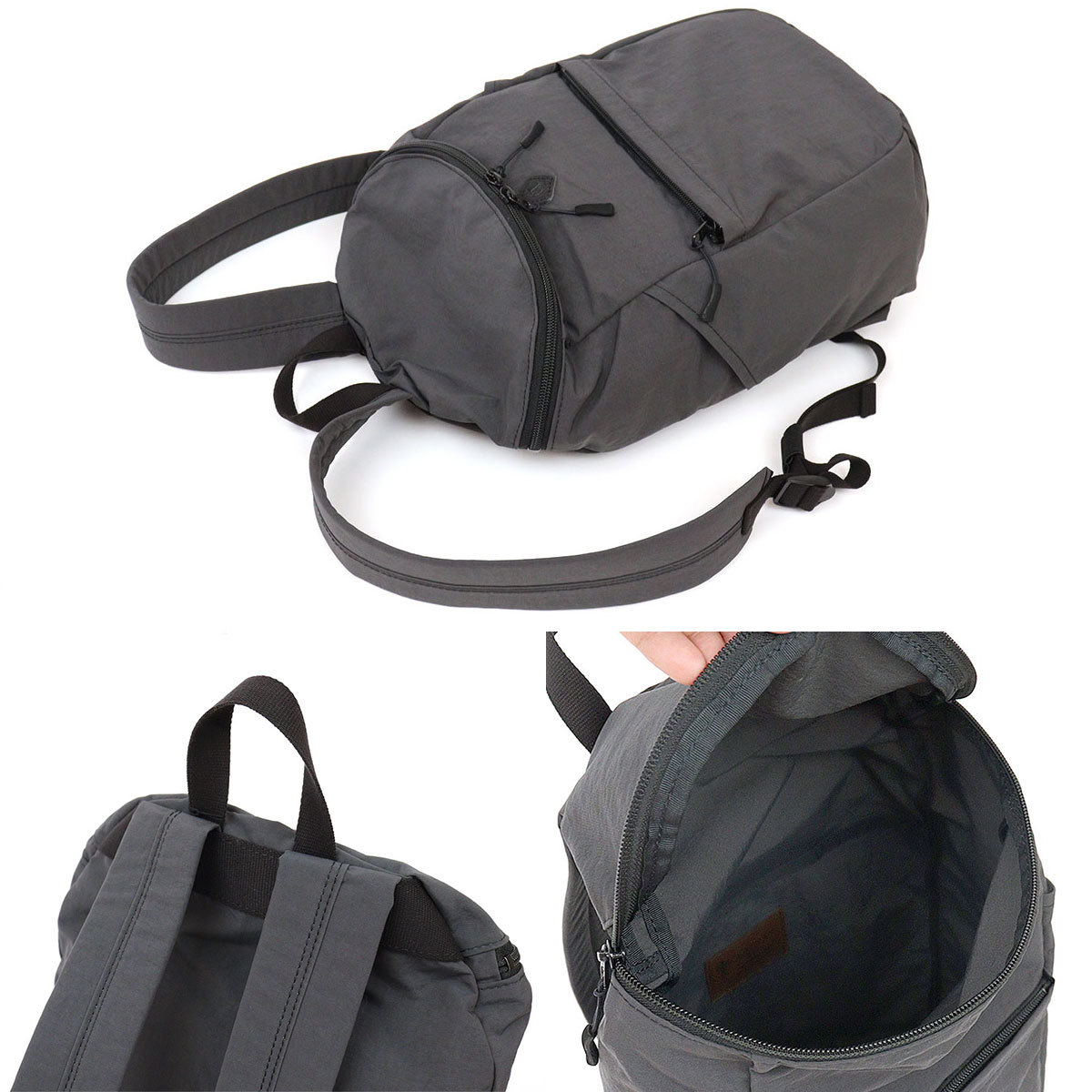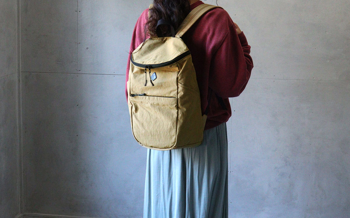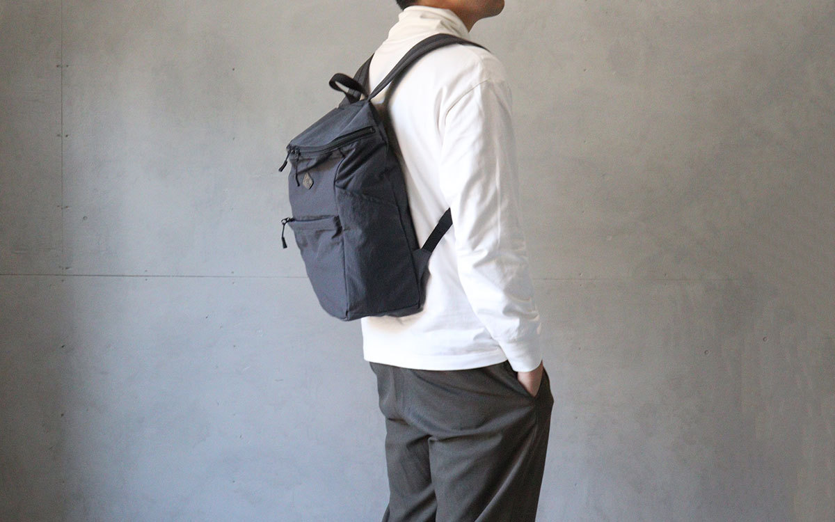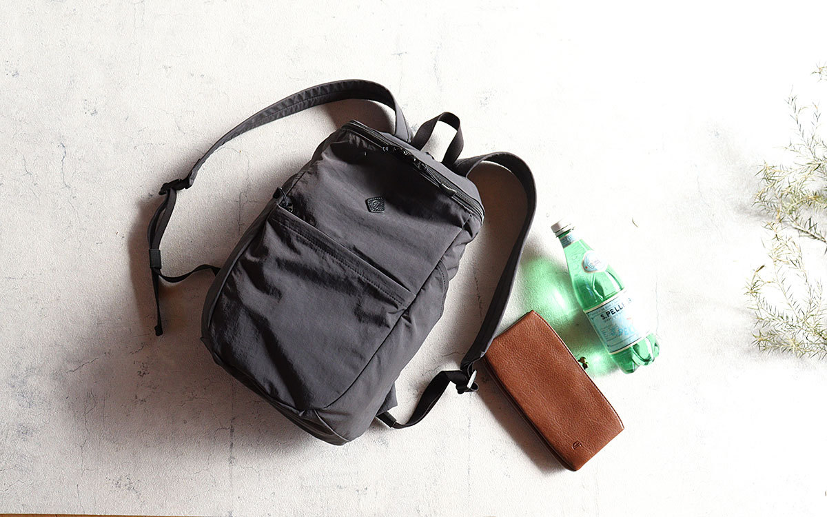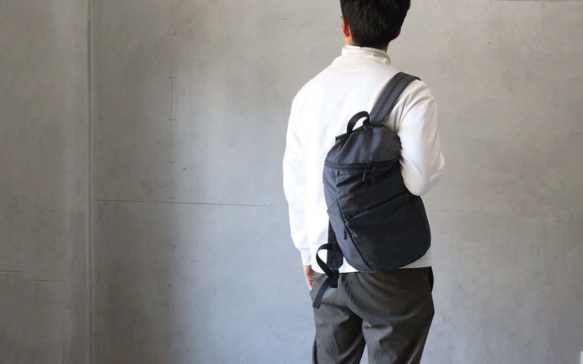 少しシャリシャリっとした質感。通勤通学はもちろん、小旅行やアウトドアにも使えるスマートなリュックサックです。一番の魅力はとことん追求した【最高の持ち心地】。とても軽量なナイロン仕立てな上、内生地をあてずに付属パーツを樹脂素材にすることで、210gという驚きの軽さを実現しました。