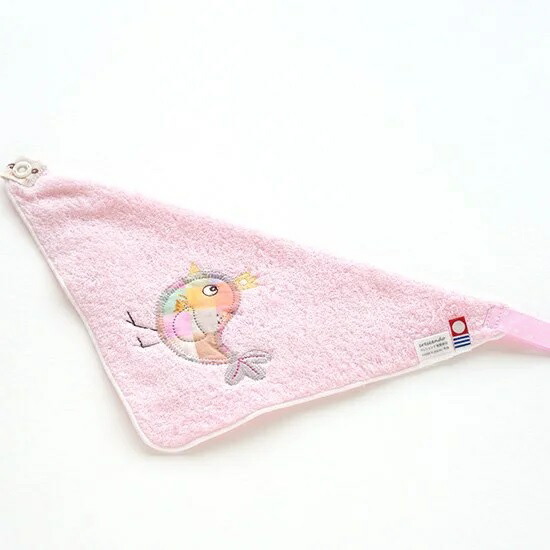 スナップを留めるとスタイ、広げるとタオルハンカチ、さらにスナップ部分がループになっているから掛けられる!