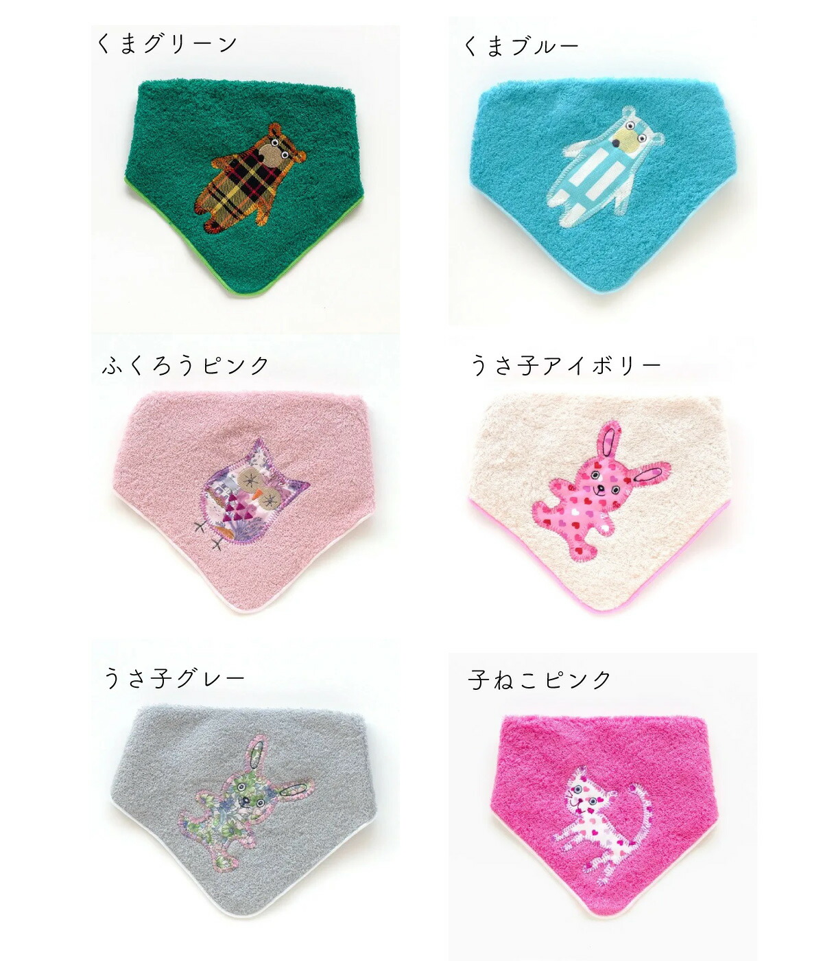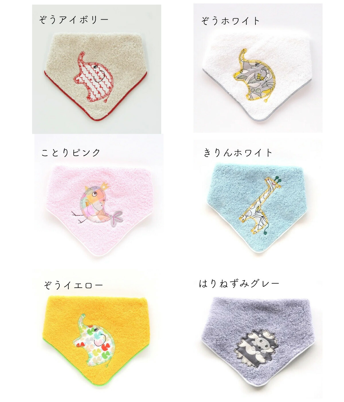 | □デザイン | ・くまグリーン ・くまブルー ・ふくろうピンク ・うさ子アイボリー ・うさ子グレー ・子ねこピンク ・ぞうアイボリー ・ぞうホワイト ・ことりピンク ・きりんホワイト ・ぞうイエロー ・はりねずみグレー ・ぷーどるピンク |