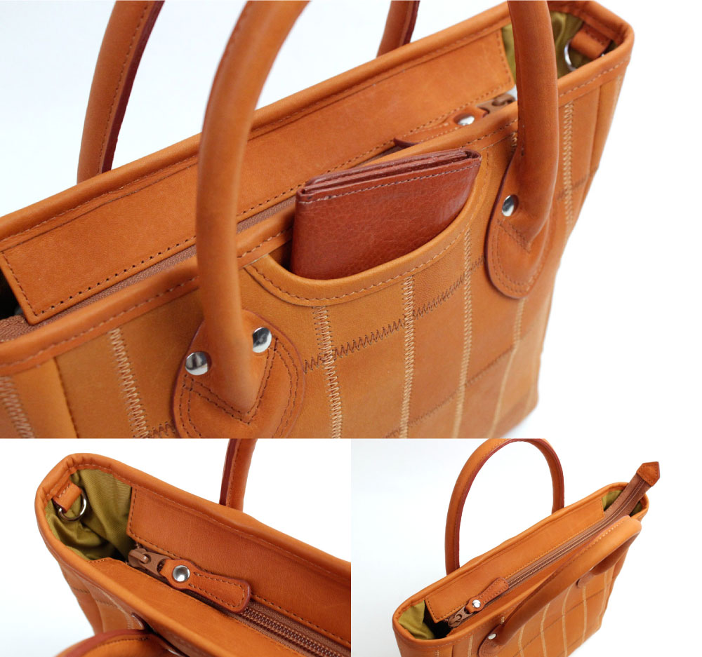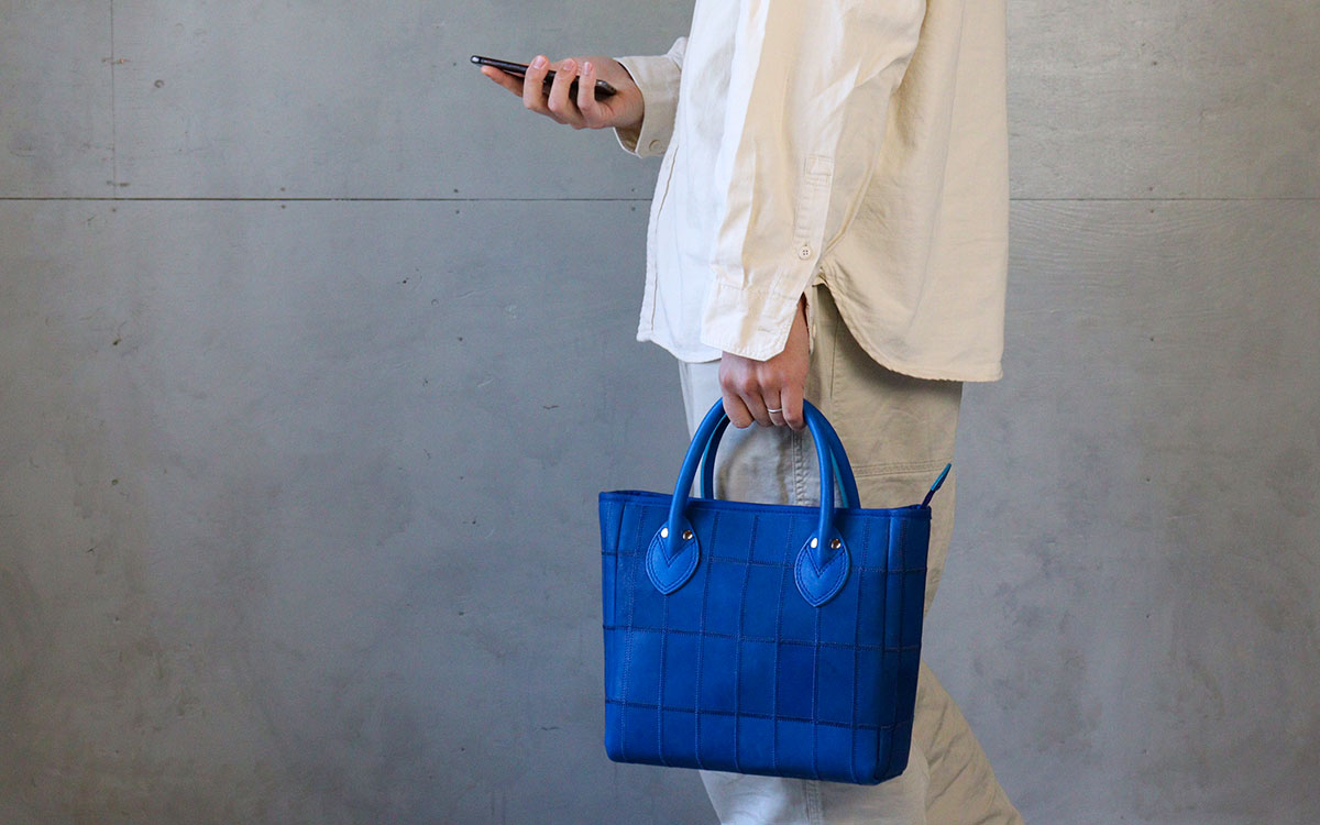 グローブ生産の際に生まれた残革をステッチで繋ぎ合わせることで新たな価値として再生する。ものづくりの原点を見つめる視点と柔軟な発想が融合して生まれた、起源を引き継ぐラインナップ。本来のトートバッグらしく、底鋲はありません。