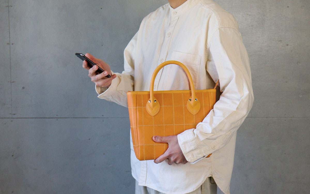持ち手の付け根(モモ)のインパクトと、きらりと光る二つのカシメが特徴的なトートバッグ。使うシーンを選ばないデザインと、「グラブメーカー」というエッセンス、ユーザーが気負わずラフに使える革かばんという存在として、ユーザーに長年愛されてきたミニトートです。