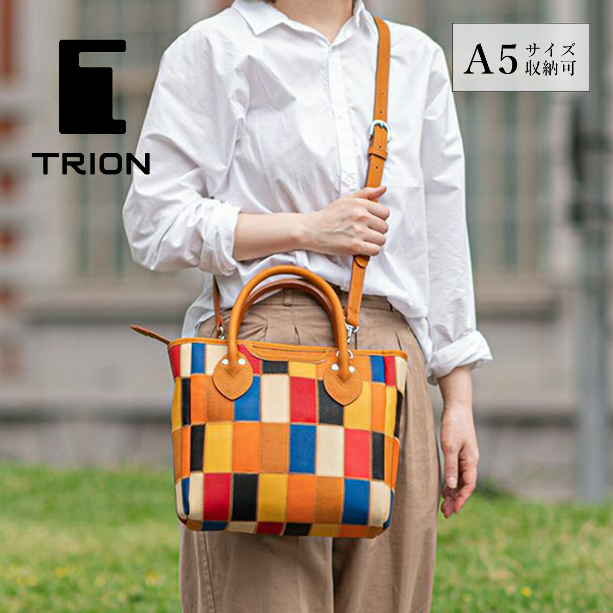 7色ものレザーを組み合わせた配色が気分を上げるマルチカラータイプです。お出かけの気分を上げる、華やかな色合い。本革ならではの質感が、上品さと落ち着きを与えます。シンプルになりがちな装いのポイントに。
