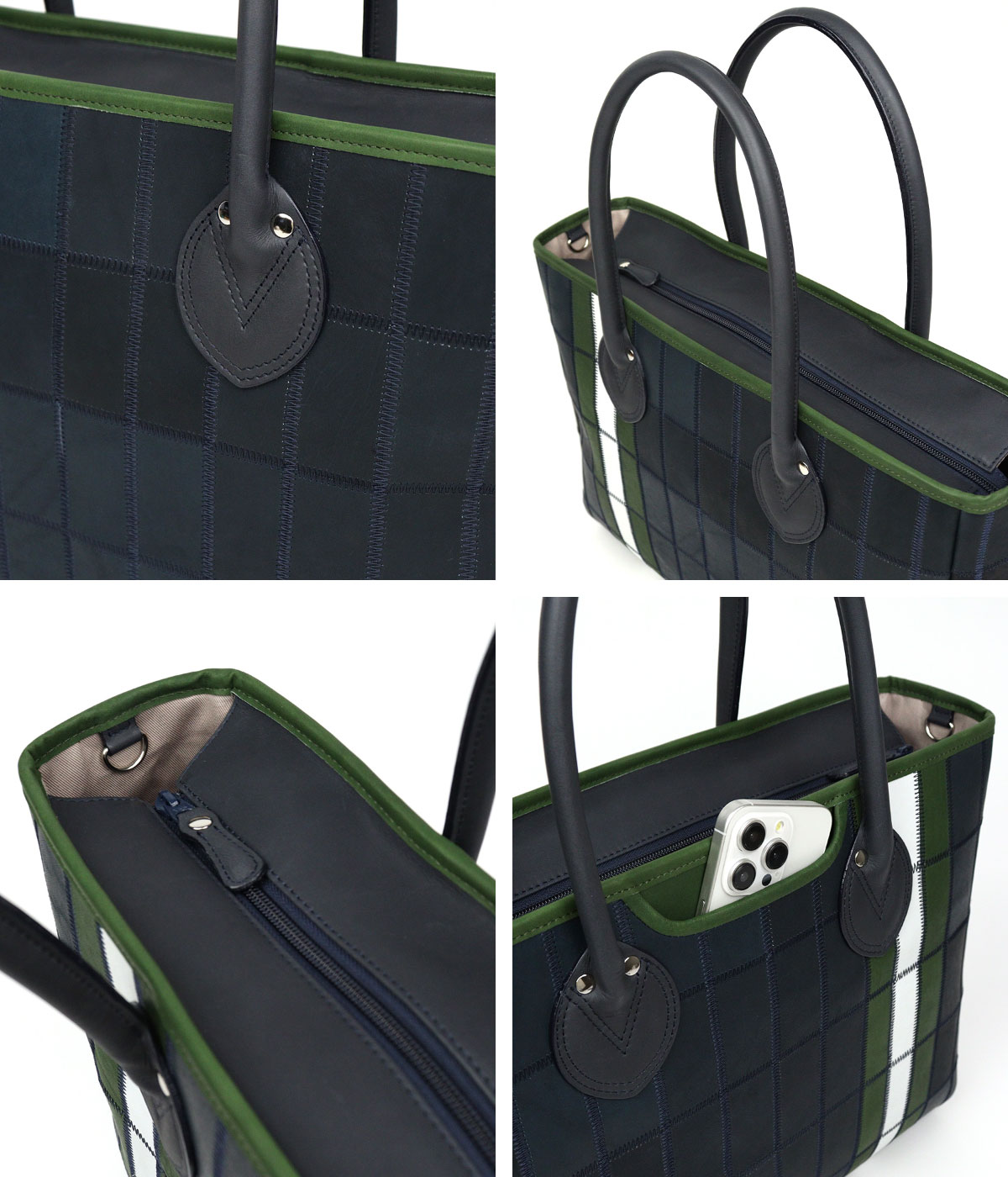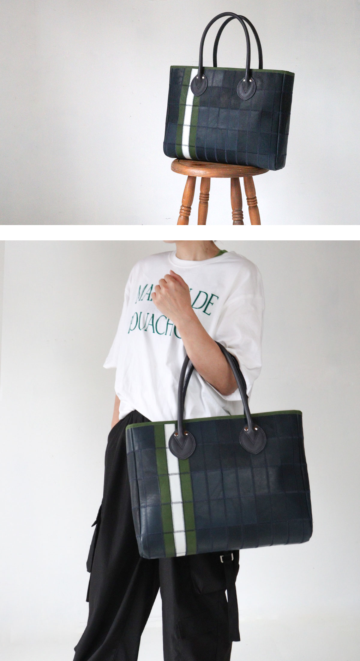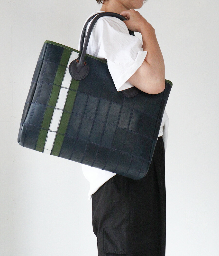 コーディネートのアクセントになるラインが特徴の本革トートが数量限定で登場。プロ仕様のグローブにも使われる、丈夫で良質なグラブレザーを一枚一枚丁寧に繋ぎ合わせた技術で、世界にひとつの表情が楽しめます。マルチカラーのような楽しさがありつつビジネスでも使いやすい落ち着きがあるのがポイントです。