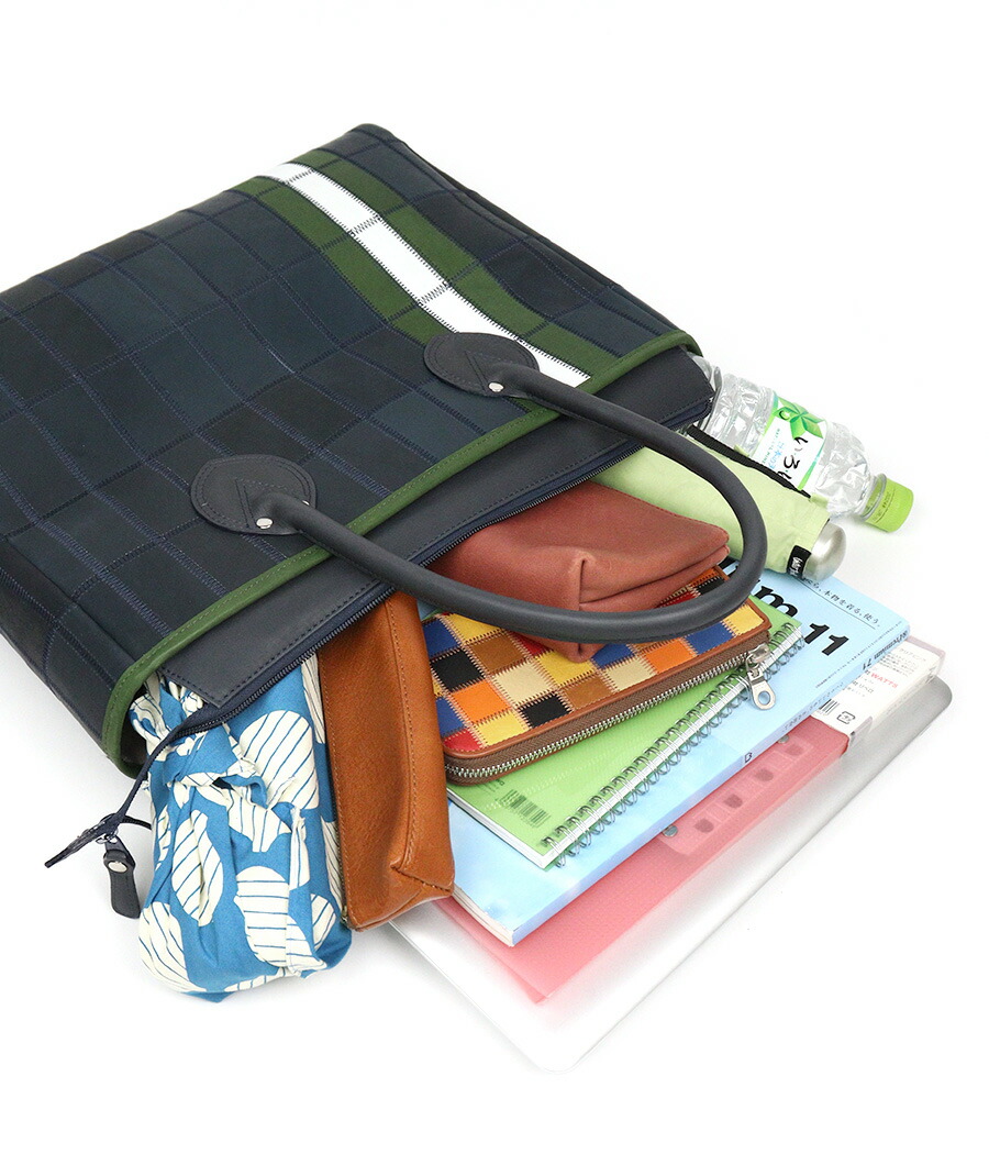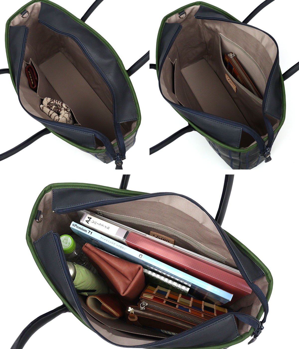 B4サイズ対応で、必要な荷物一式が余裕で入る大容量。横型は縦型よりマチが2cm薄いので肩掛けもしやすく、開口部が広いためファイルやPCなど、横向きで持ち運びたいアイテムが出し入れしやすいつくりです。