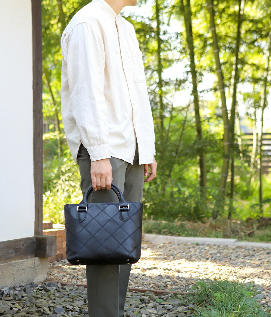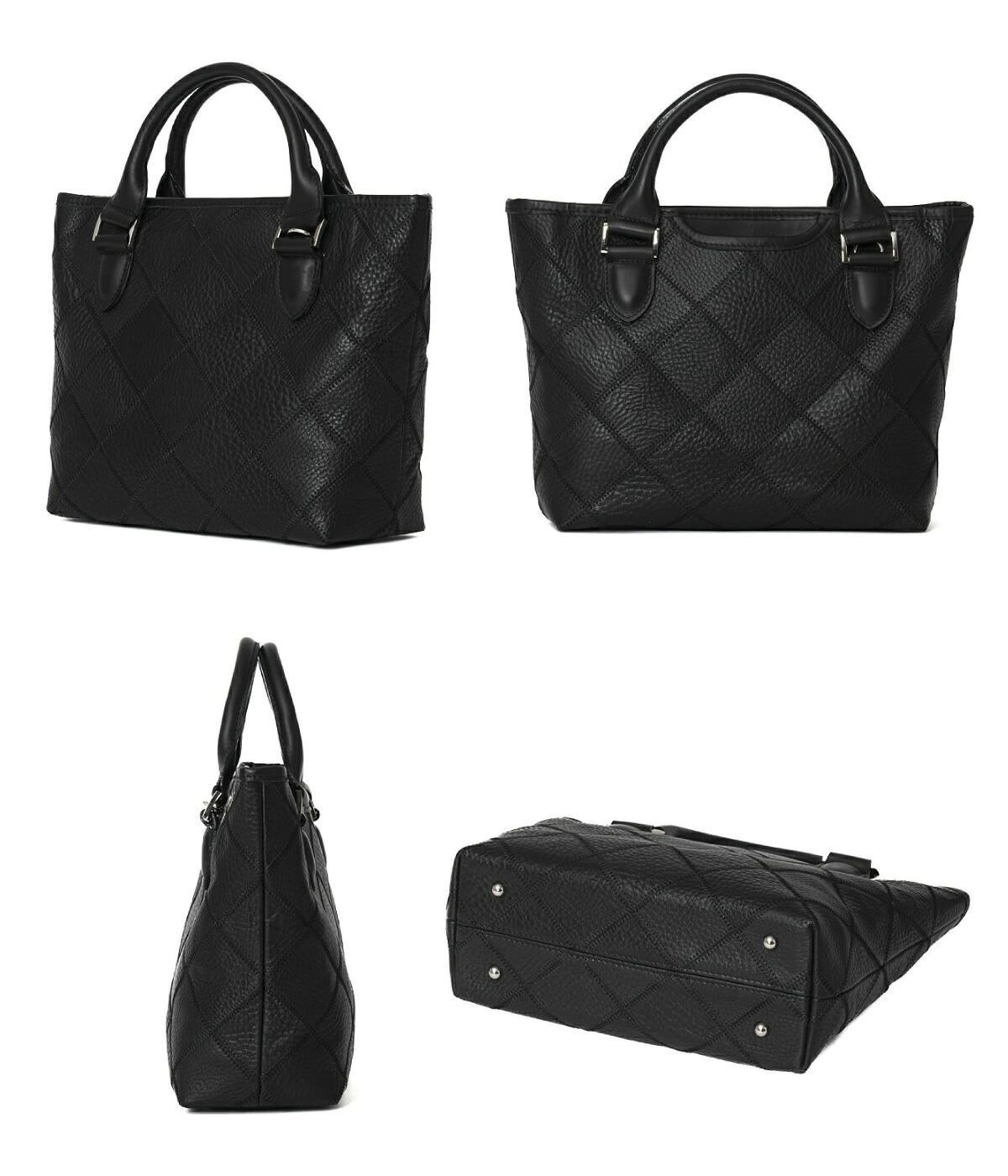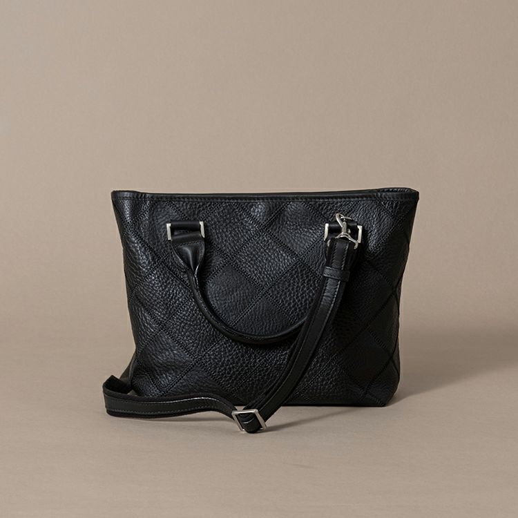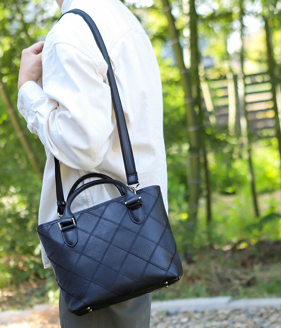 正方形にカットした1枚1枚凹凸の異なるシボ革(タンブルレザー)の組み合わせで、1点ずつ表情の異なる他にはないバッグに。