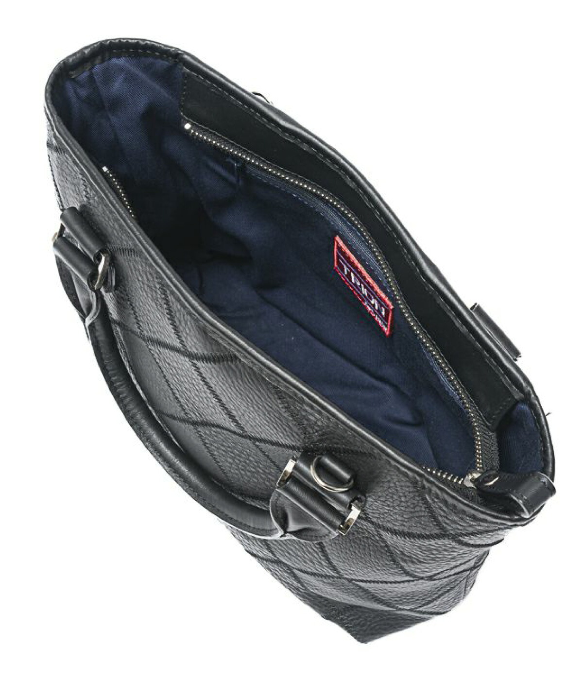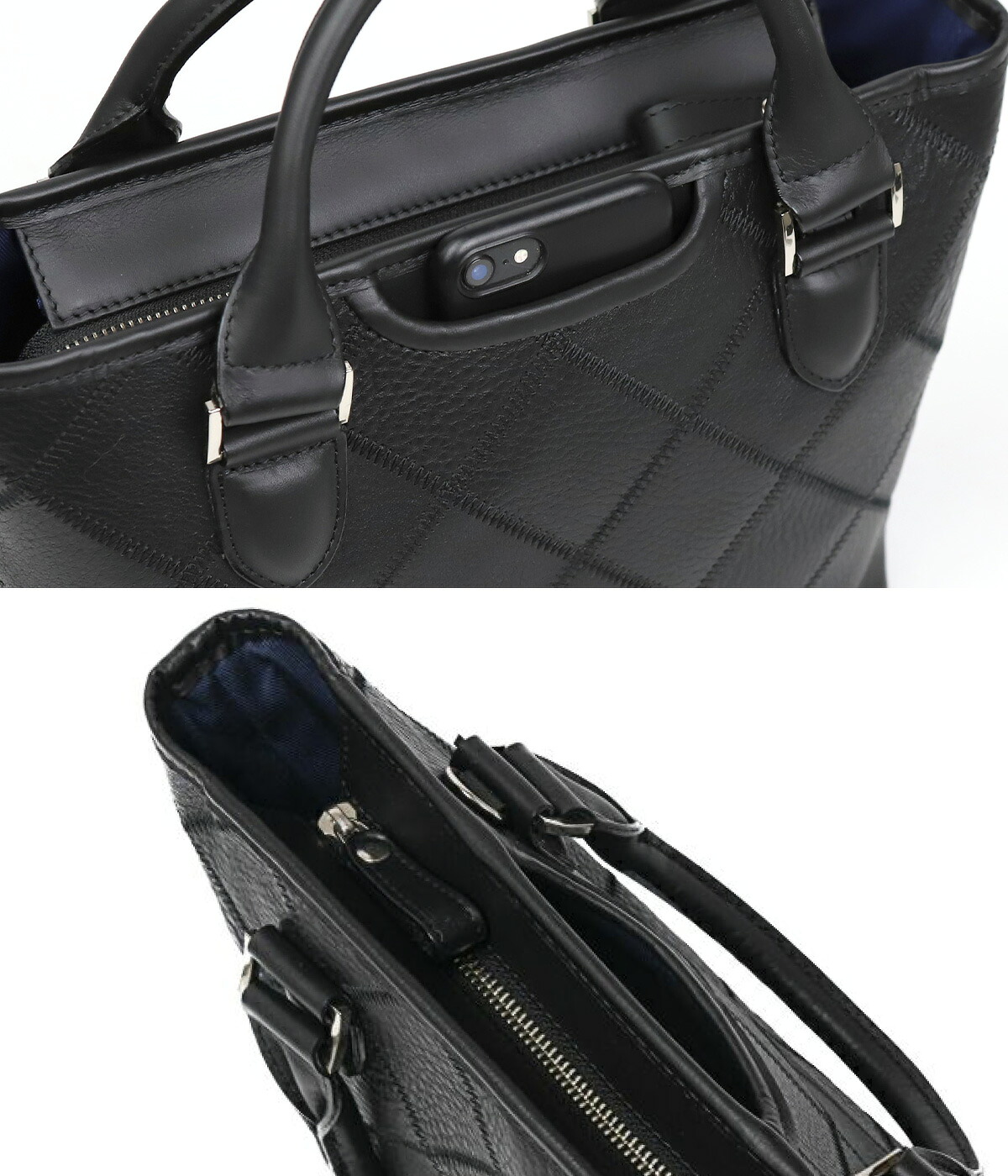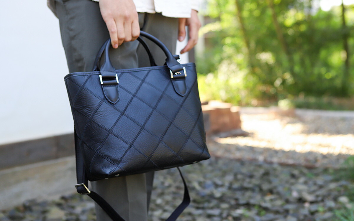 正方形にカットした1枚1枚凹凸の異なるシボ革(タンブルレザー)の組み合わせで、1点ずつ表情の異なる他にはないバッグに。