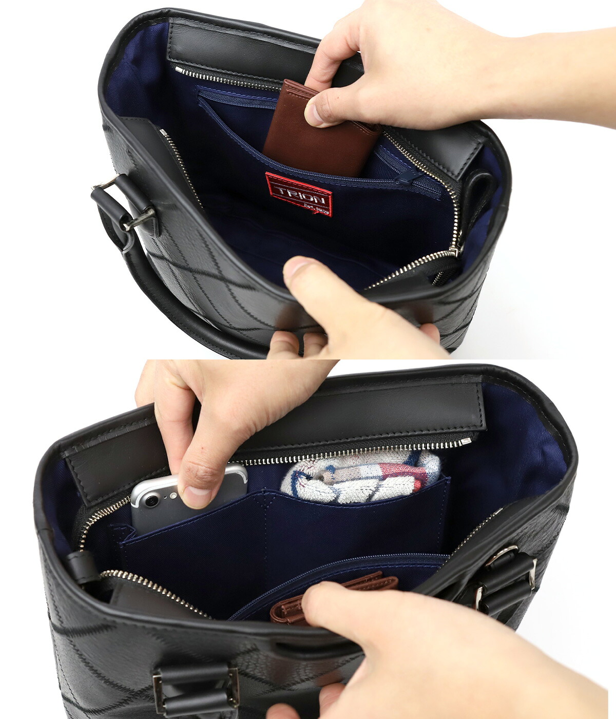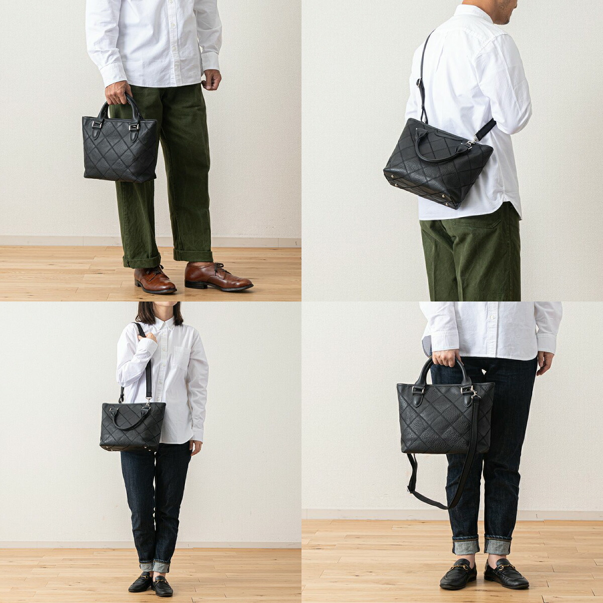 コンパクトサイズのショルダートート。着脱式のショルダーストラップでシーンに合わせて使い分けられる2Way仕様です。落ち着いたデザインで男女問わずに使用できます。