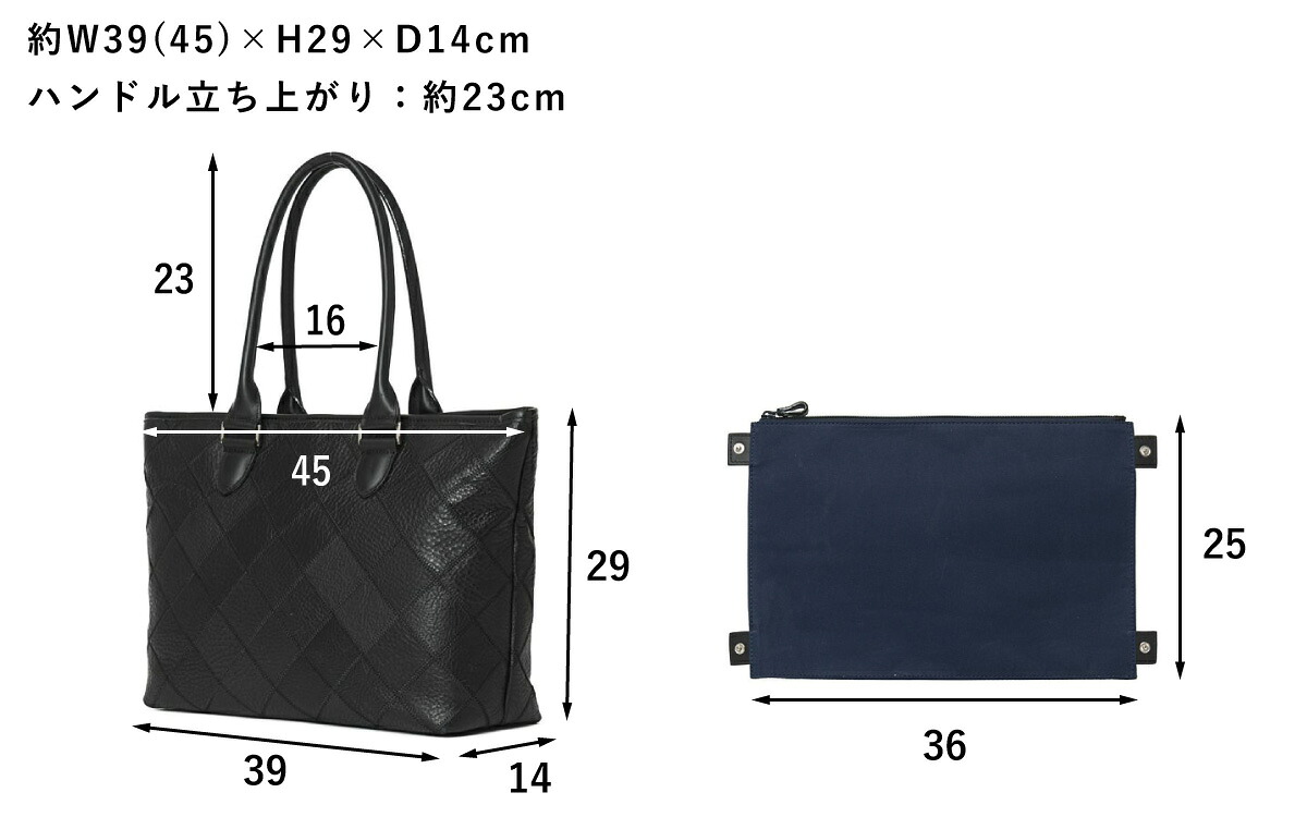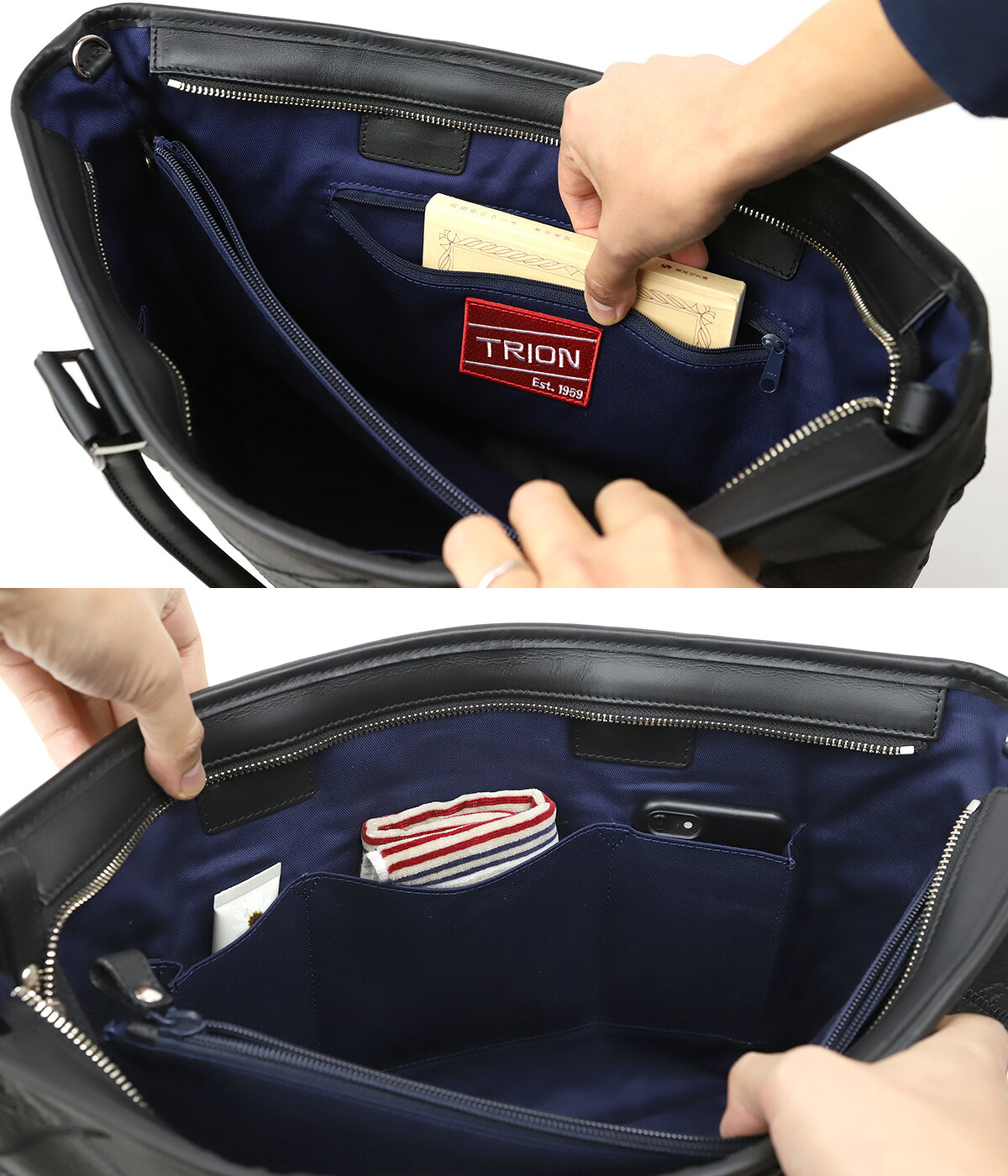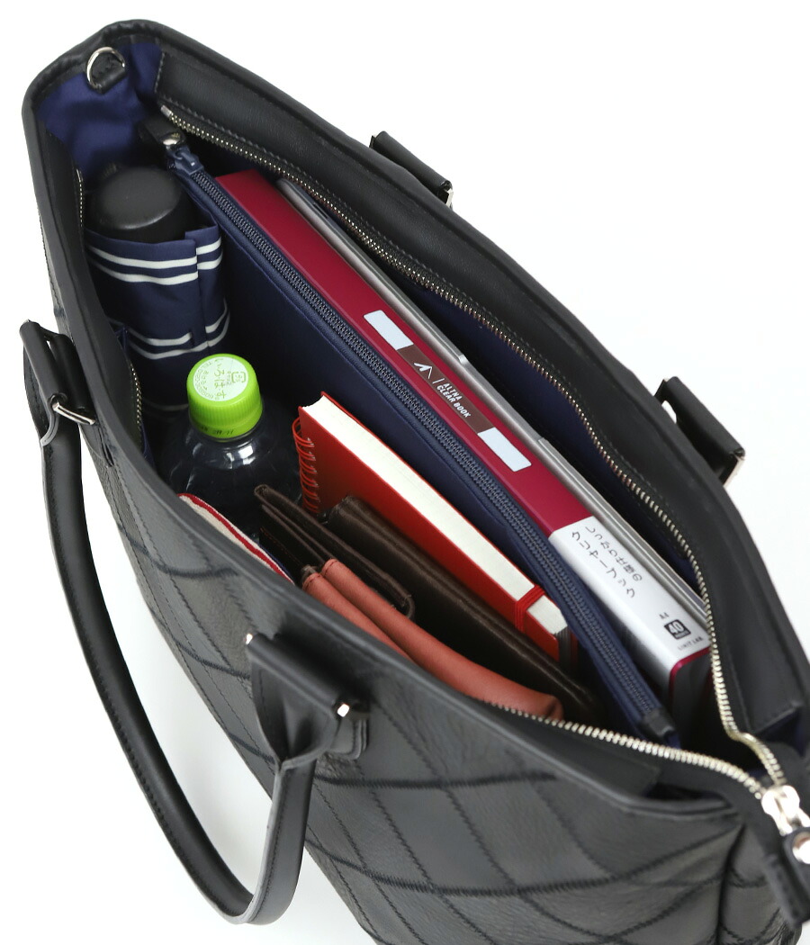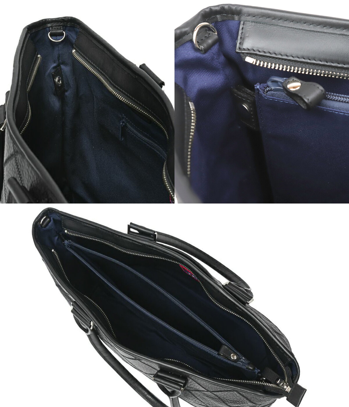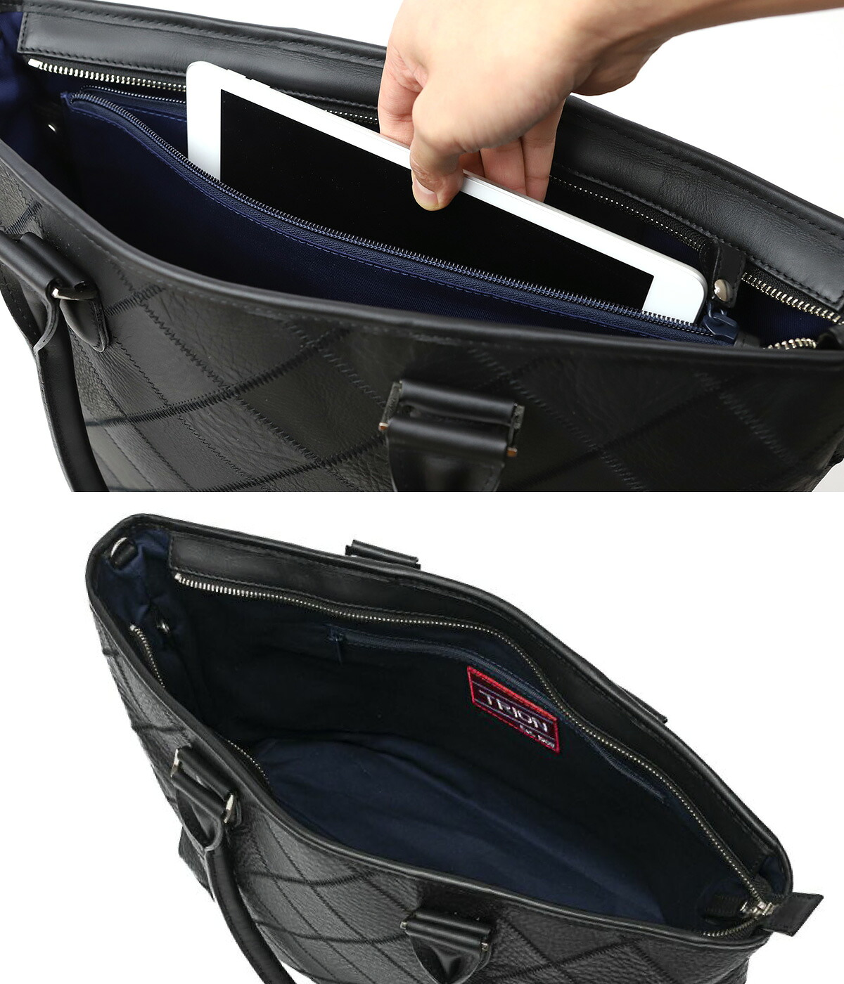 仕切りポケットはファスナー付き。タブレット端末などの収納に便利です。 内装生地はシックなネイビーを採用し、高級感ある仕上がりに。底部分のマチ幅が14cmあり、普段使いにちょうど良い大きさです。