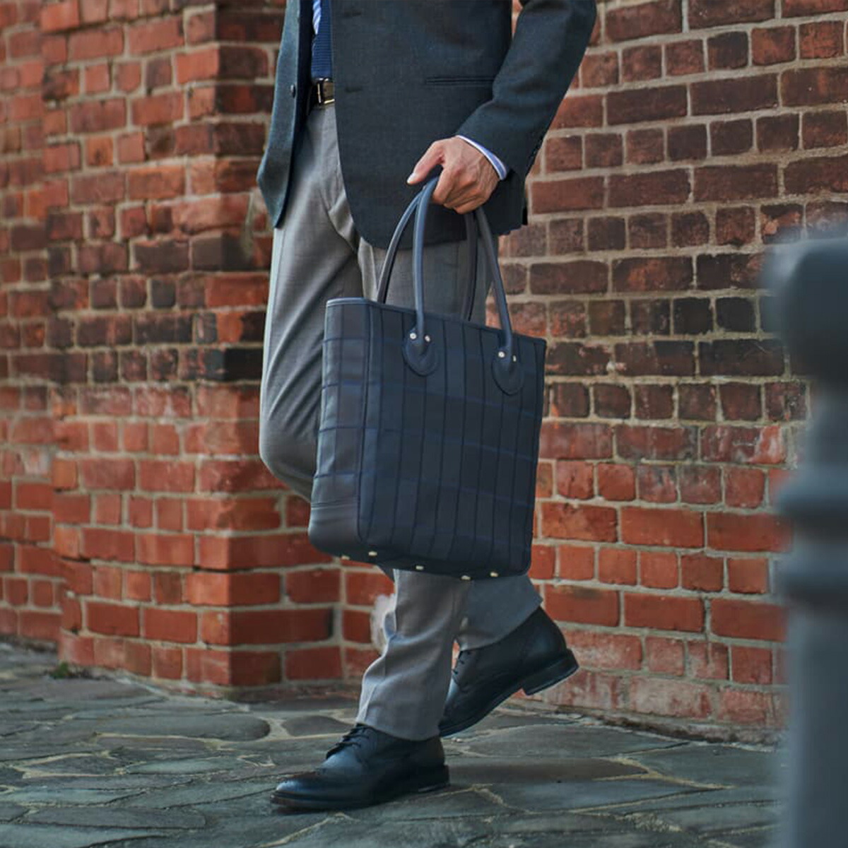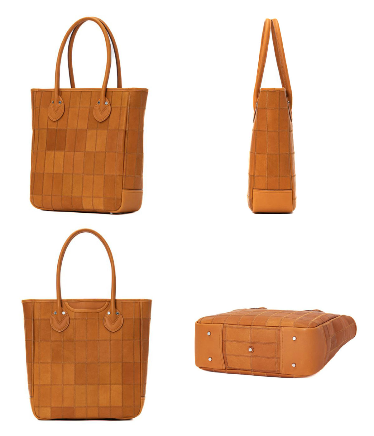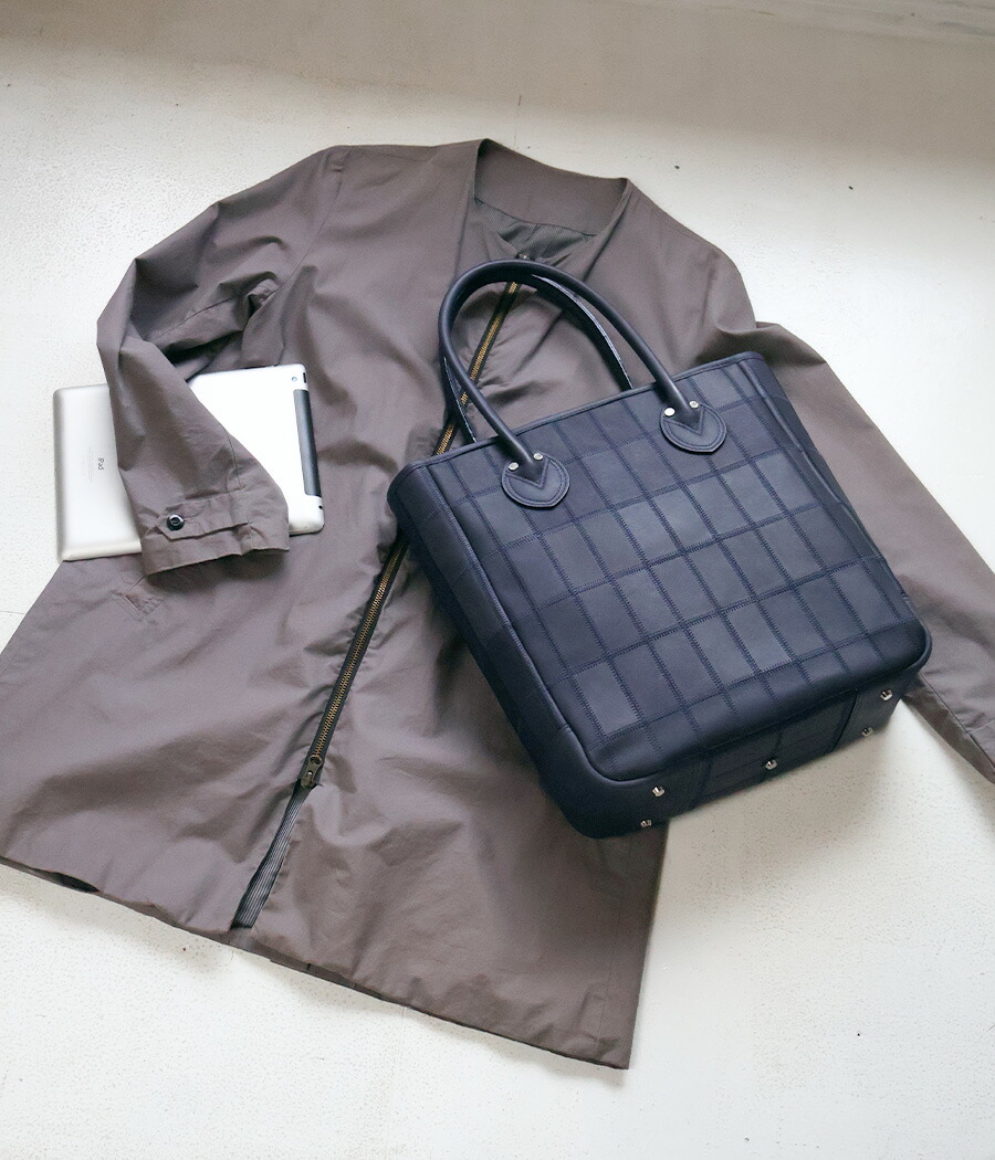 通勤でも、外出先でも使用できるパネルトート。 底面には新たに底鋲(そこびょう)を追加。床置き時にも安定し、革の摩耗や型崩れを防ぎながら、美しい状態を長く保つことができます。