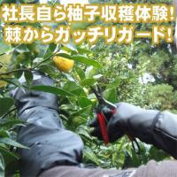 ![]() アーカム社長の私、濱野も自ら収穫を体験させて頂きました。確かにこのトゲを掻き分けながらの収穫は大変!手袋着用時には一切トゲは刺さりませんでしたが、ご意見頂いた通り、試作品時にはハサミを握るのに長時間はキツイと感じました。この経験を元に改良された手袋は高評価!バッチリとトゲ対策も作業のしやすさも改善されました! | ![]() こんなにたくさん採ってしまいました;しかもそのまま収穫した柚子は頂いてしまい;本当にありがとうございました。 |