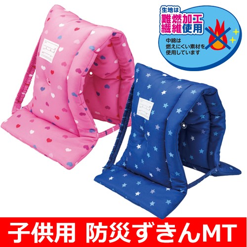 燃えにくい中綿素材を、衝撃に耐えるようにたっぷり使用した防災ずきんMT。デザインは青い星柄とピンクのハート側の2種類です。大人の目線で見下ろしてすぐに判別出来る名前ラベル、また取り外しも簡単な椅子固定用のゴムバンド付き。外の音も耳あなが付いているので聞こえやすくなっています。