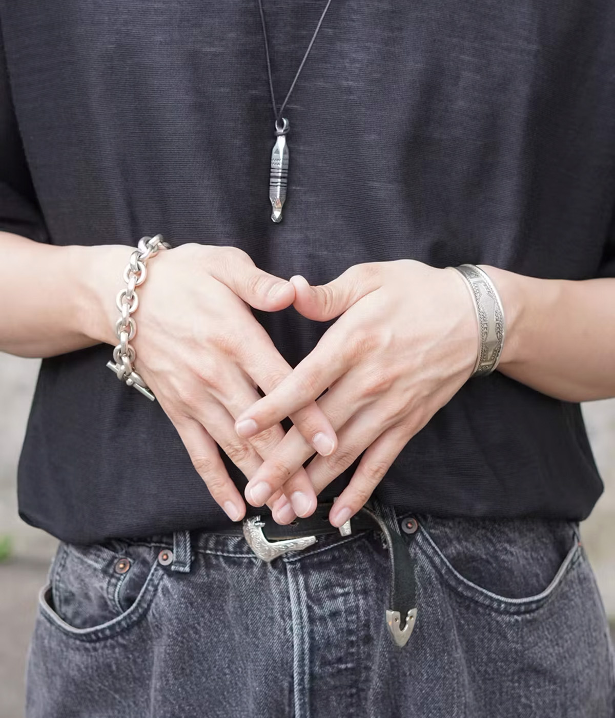 ・中央の文様とその周りに彫られた鱗のような細かい彫刻が特徴になり、他のブレスレットと一緒につけても使用しやすいボリュームが魅力的な商品